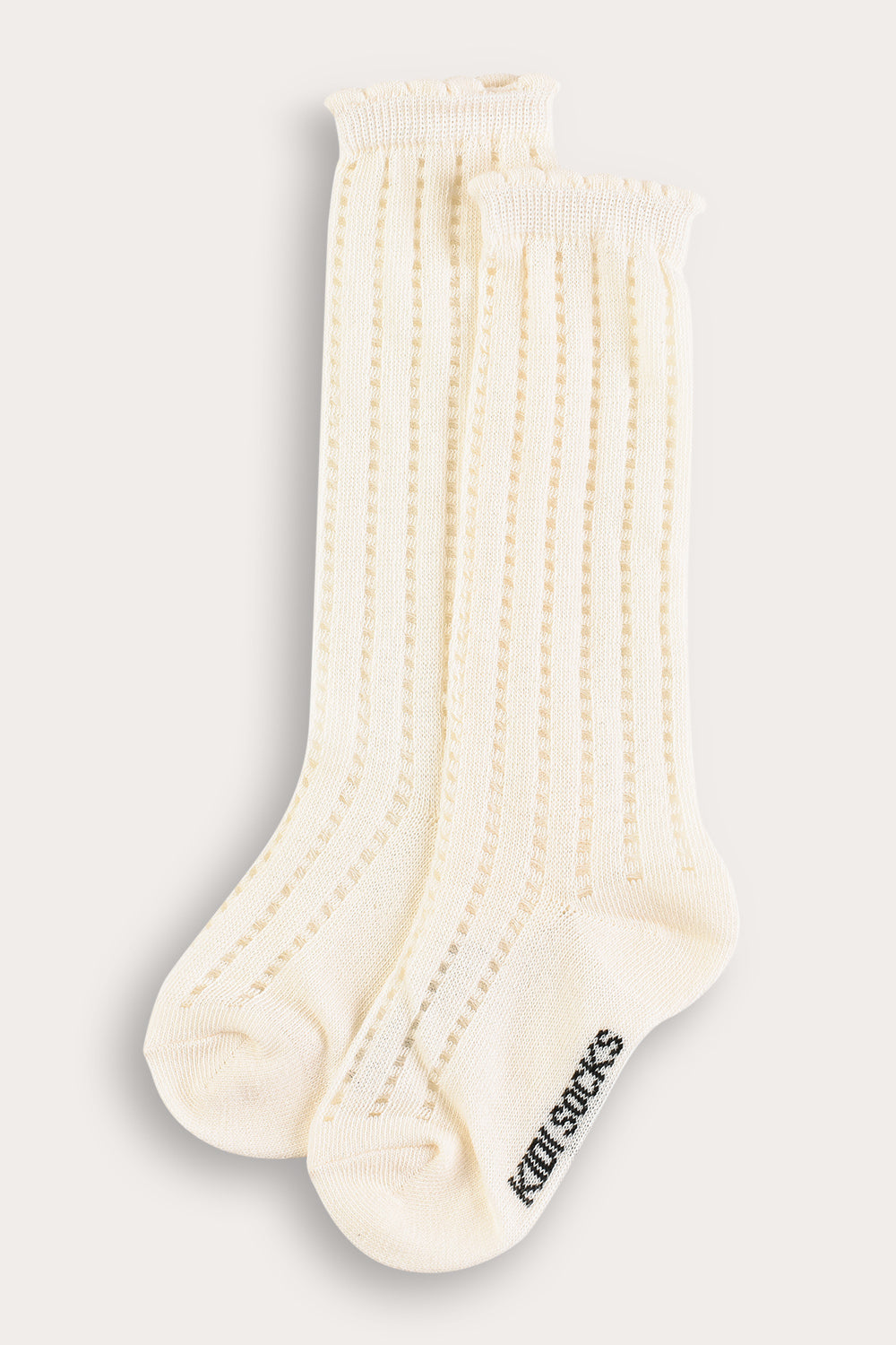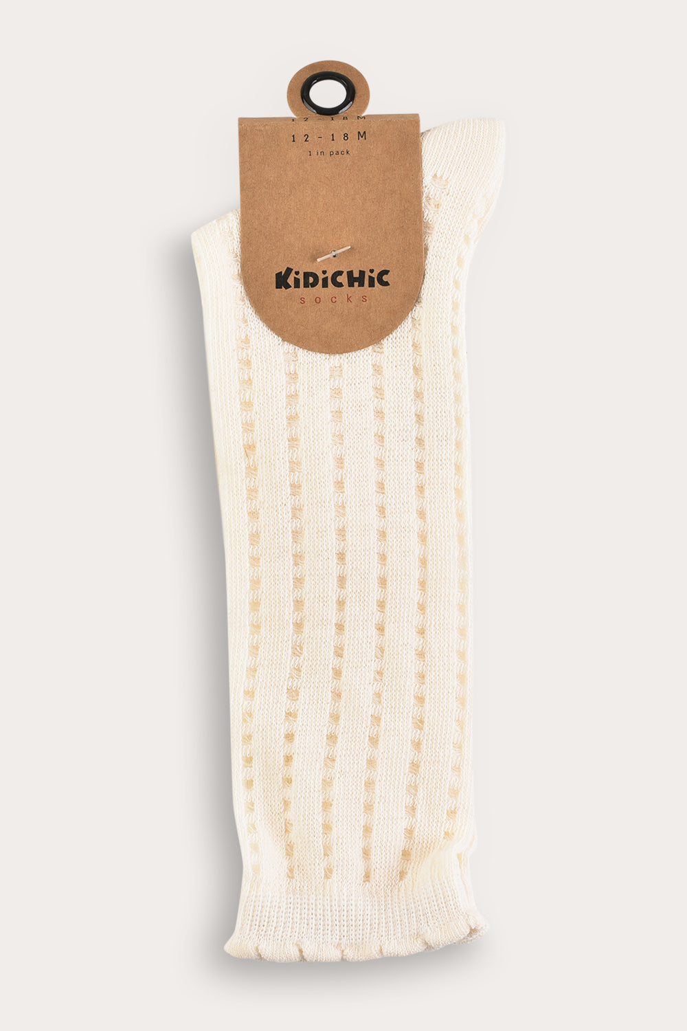 גרביים אלסטיות לתינוקות, בעיצוב יוניסקס המתאים לבנים ולבנות כאחד. גזרה גבוהה באורך הברכיים וחורים עדינים ליצירת מראה אלגנטי של תחרה, בשילוב עם אוורור וגמישות - לנוחות מקסימלית לאורך כל היום.