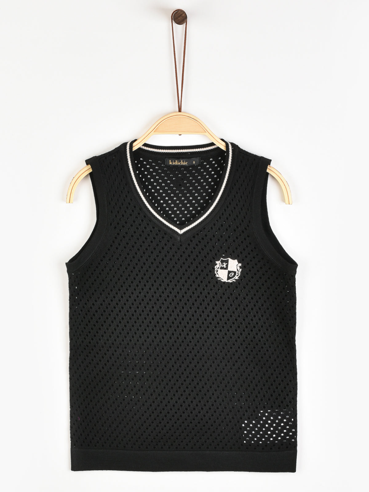 אפודת סריג בסיומת ריב, עם פאטץ' מלכותי למראה חגיגי ומוקפד.