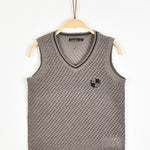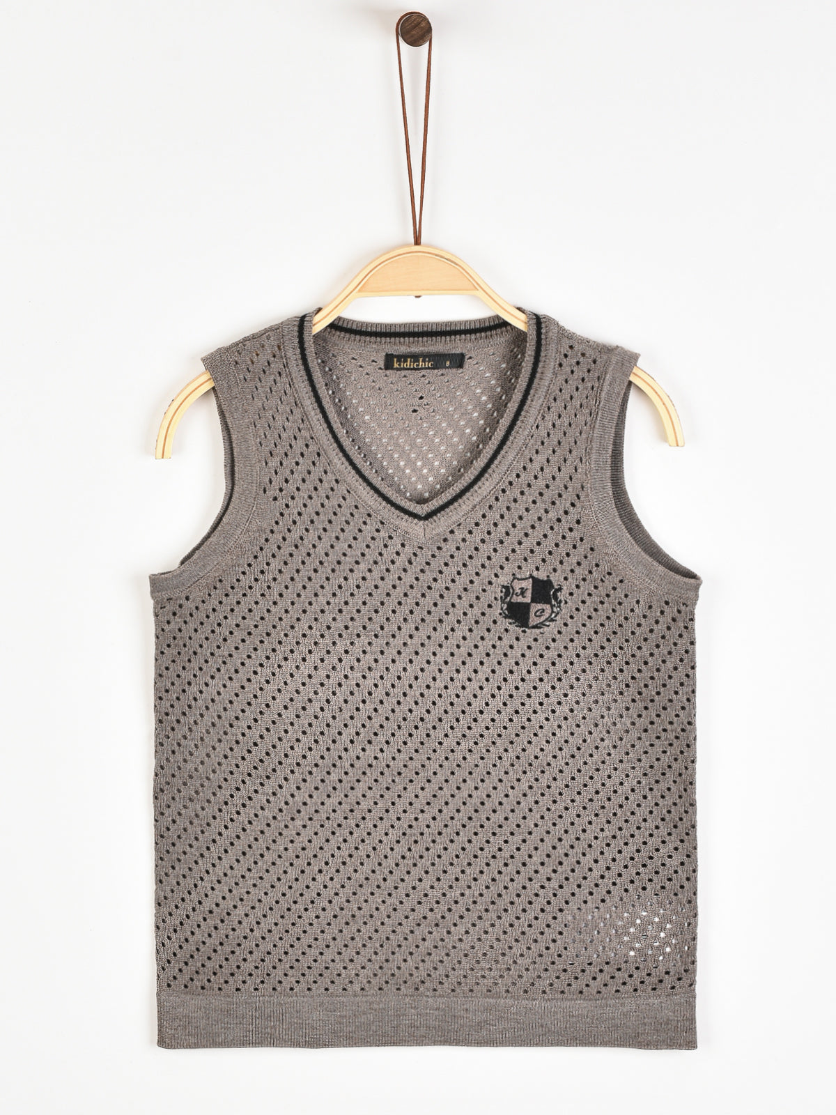אפודת סריג בסיומת ריב, עם פאטץ' מלכותי למראה חגיגי ומוקפד.