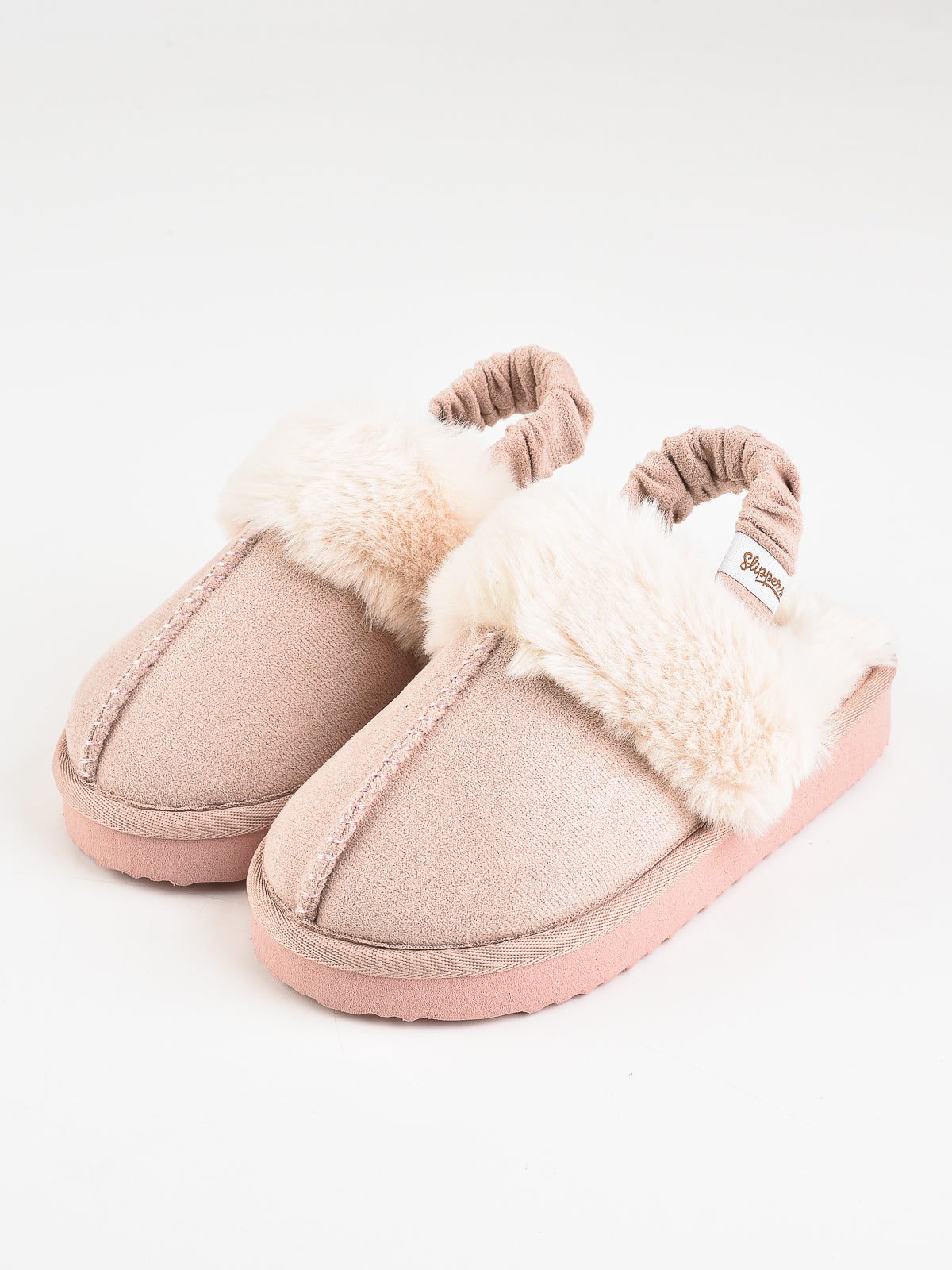 נעלי בית סגורות עם פרווה ורצועה אחורית עם גומי.