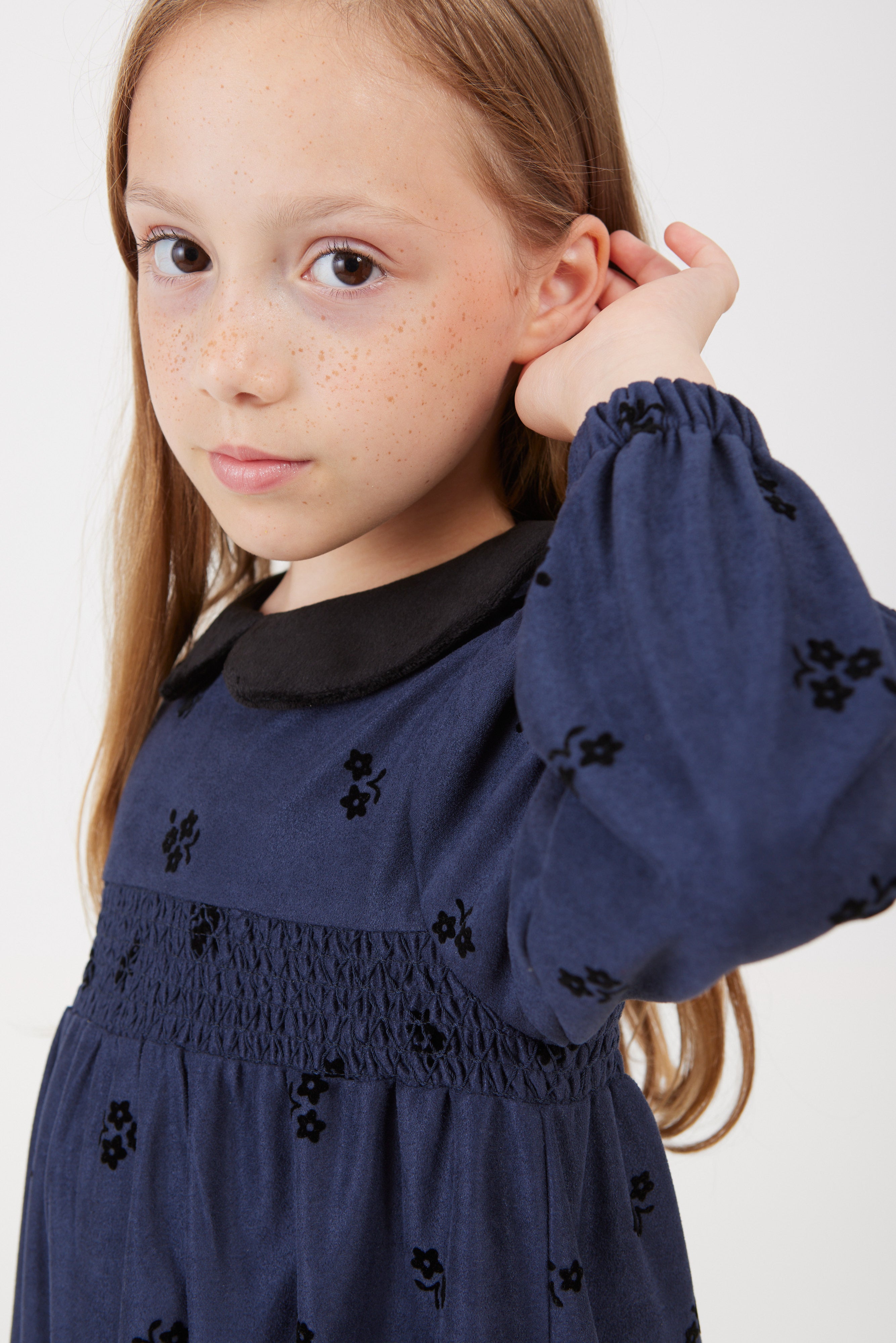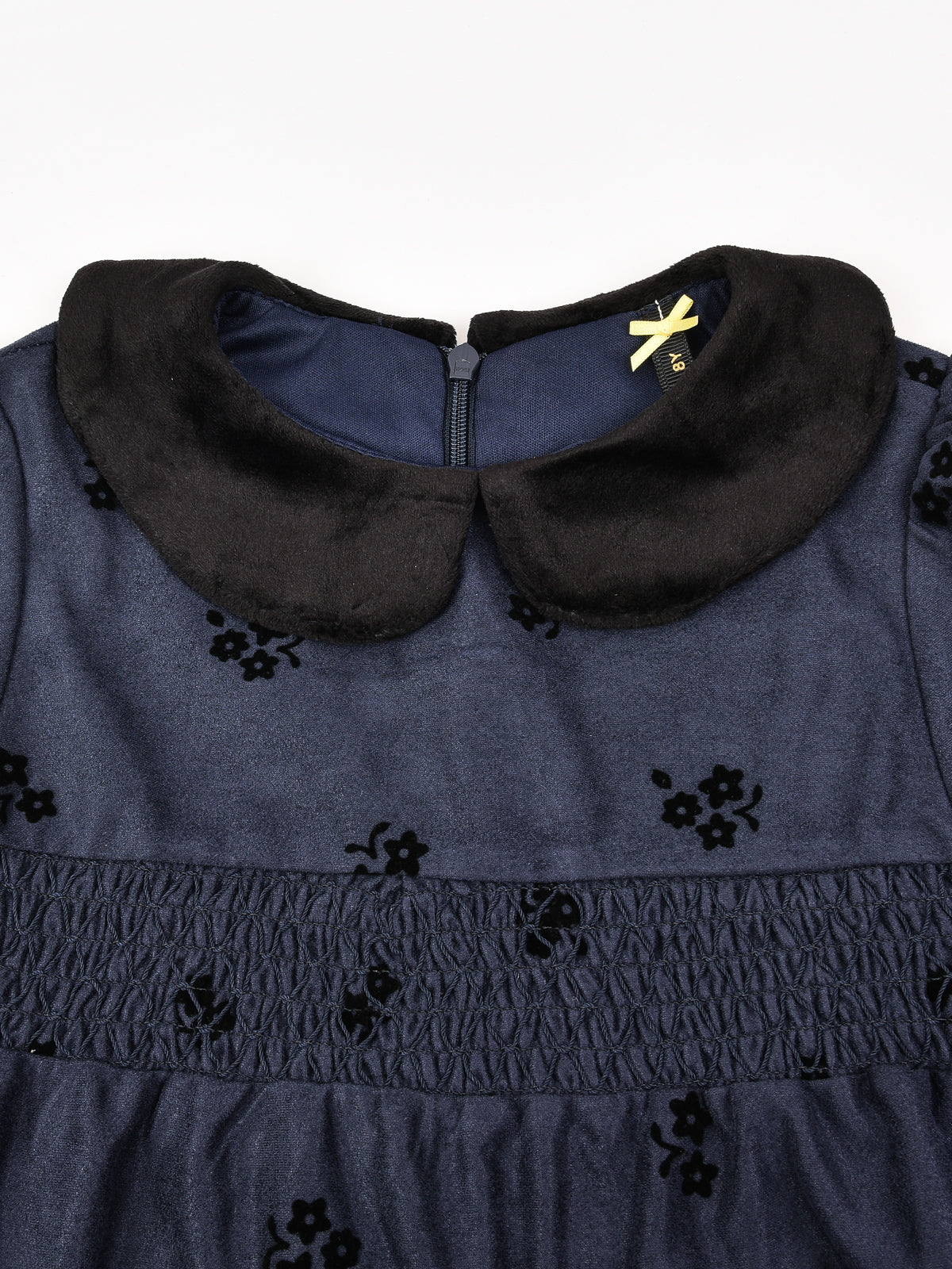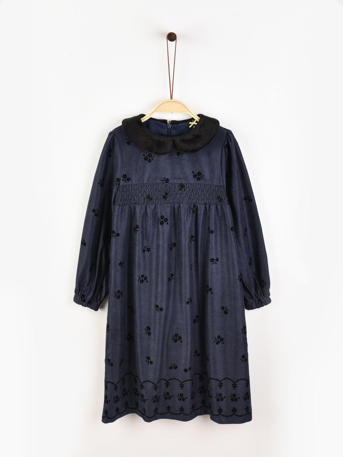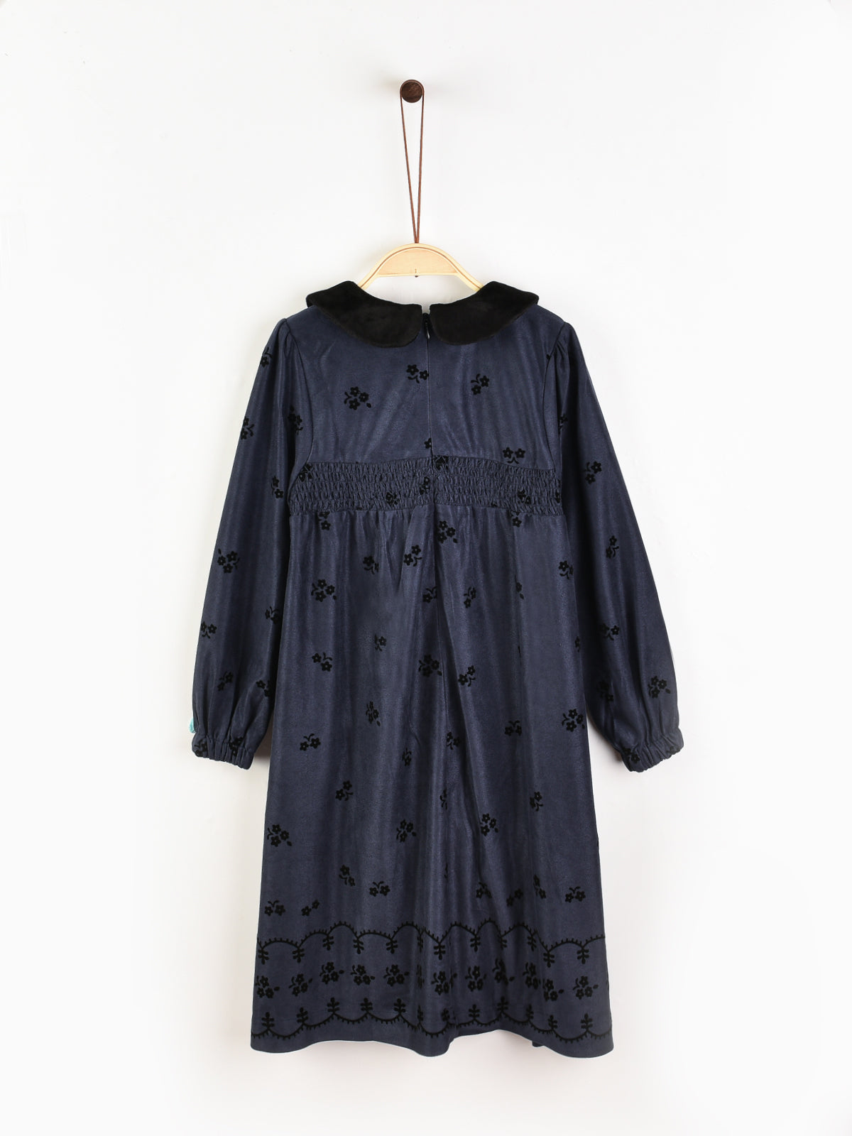 שמלה פרחונית עם צווארון קטיפה - נייבי