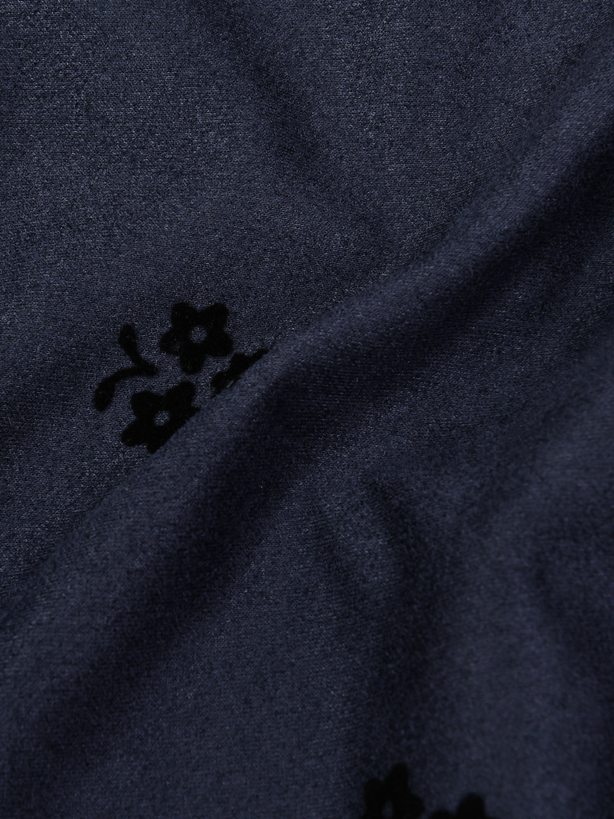 דוגמה פרחונית שמוסיפה רכות וקסם, עם צווארון עגול מקטיפה למראה חגיגי ומתוק.
