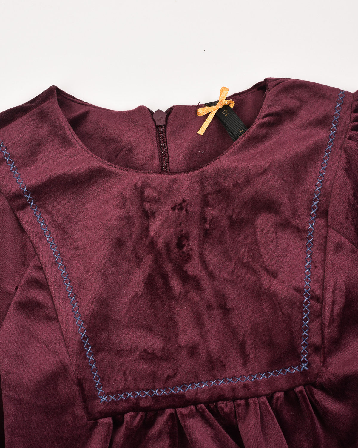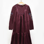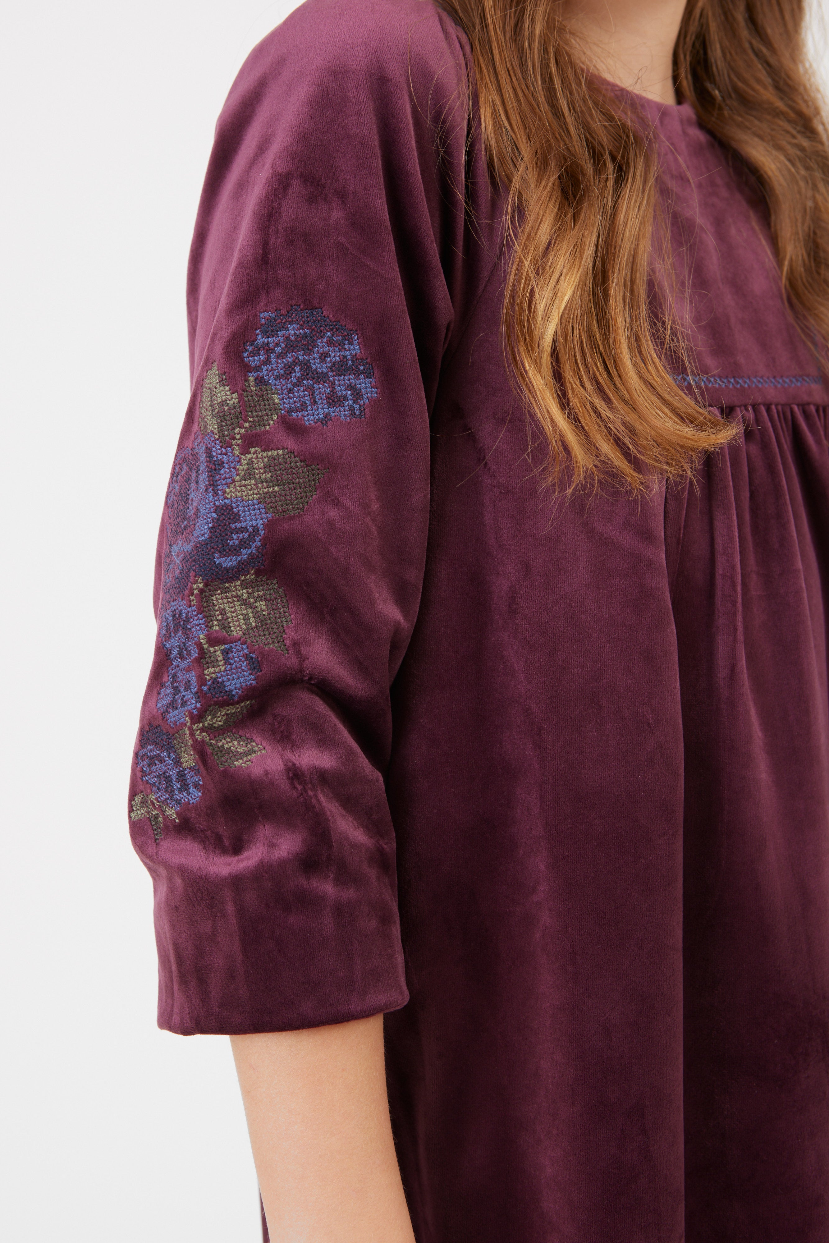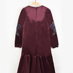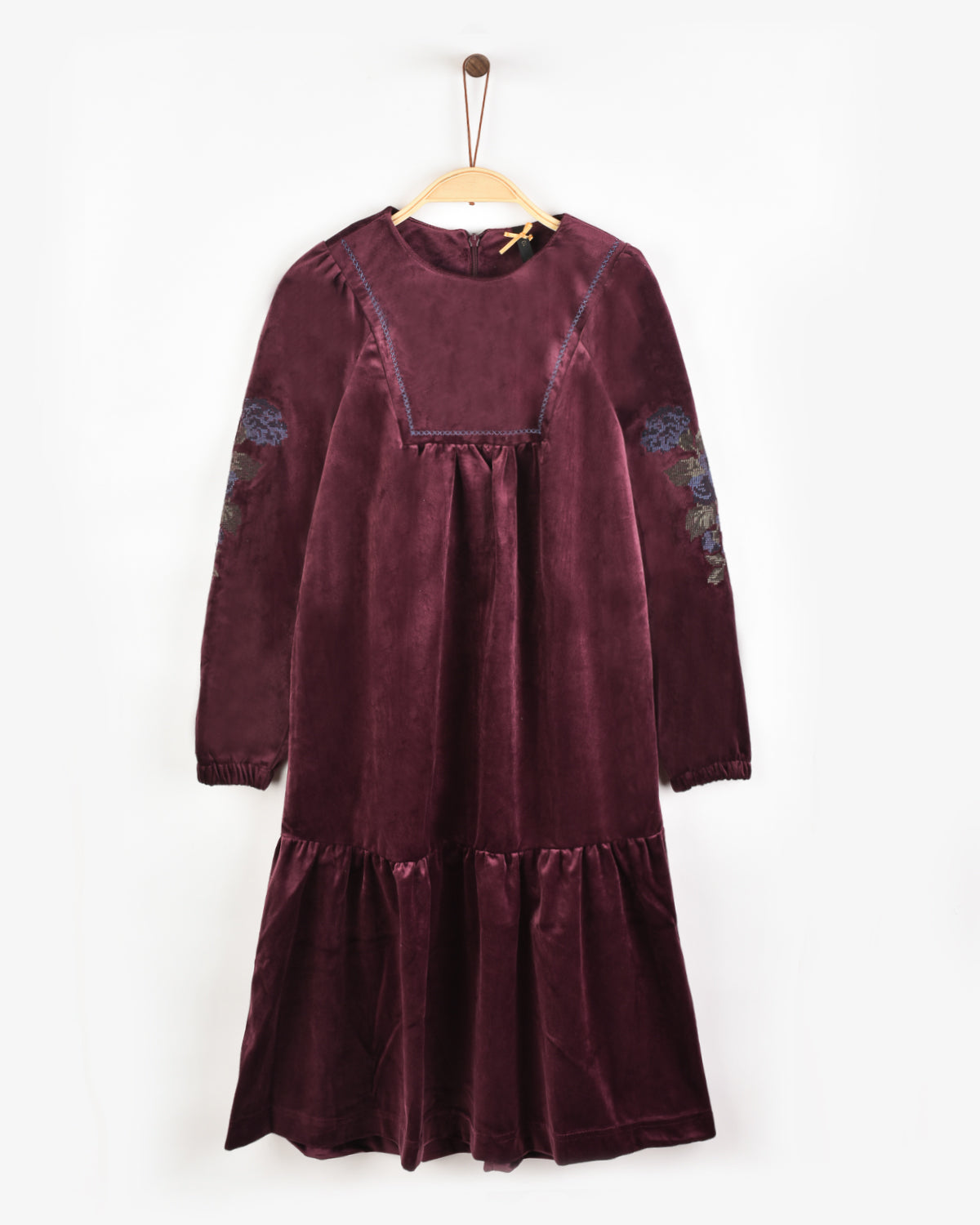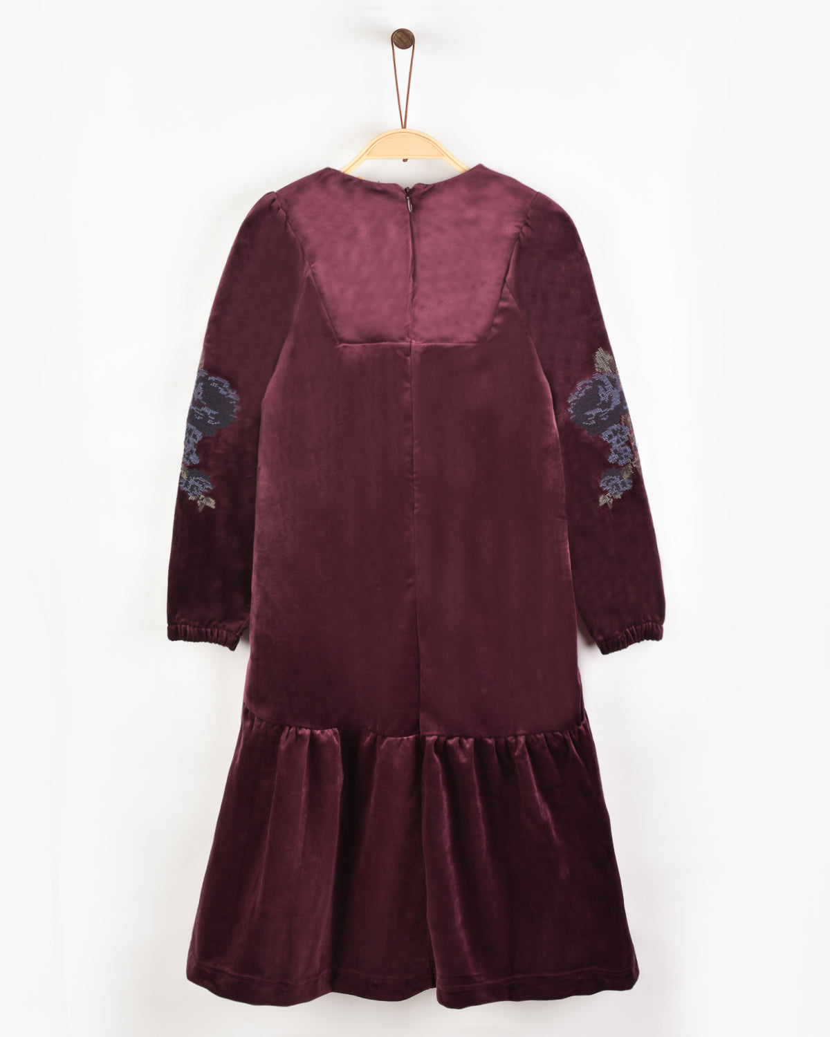 שמלת קטיפה עם רקמת פרחים - בורדו