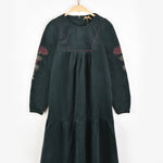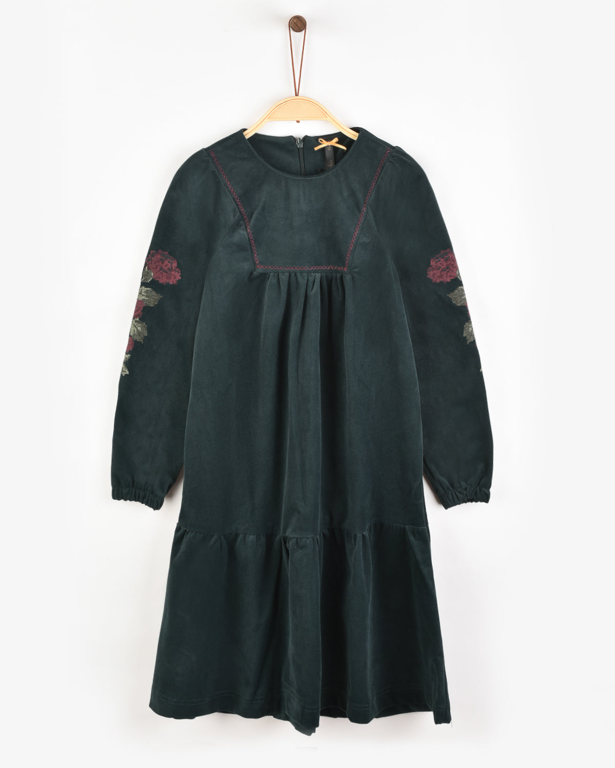 שמלת קטיפה עם רקמת פרחים - ירוק