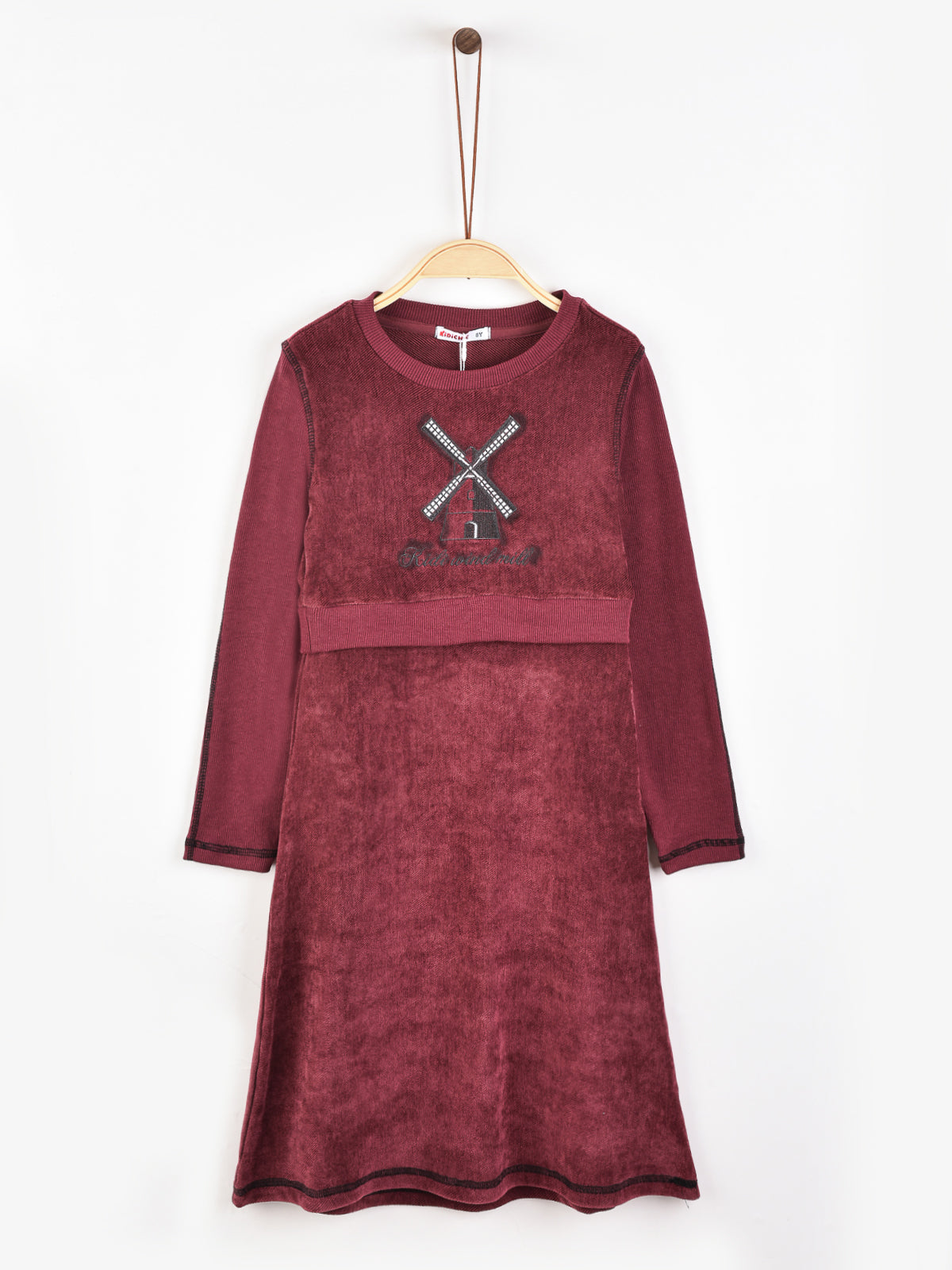 שמלת קטיפה עם רקמת פרחים - בורדו