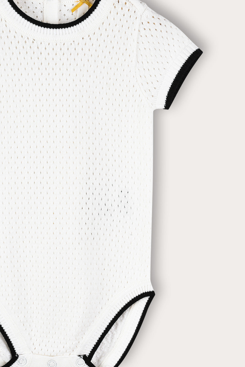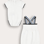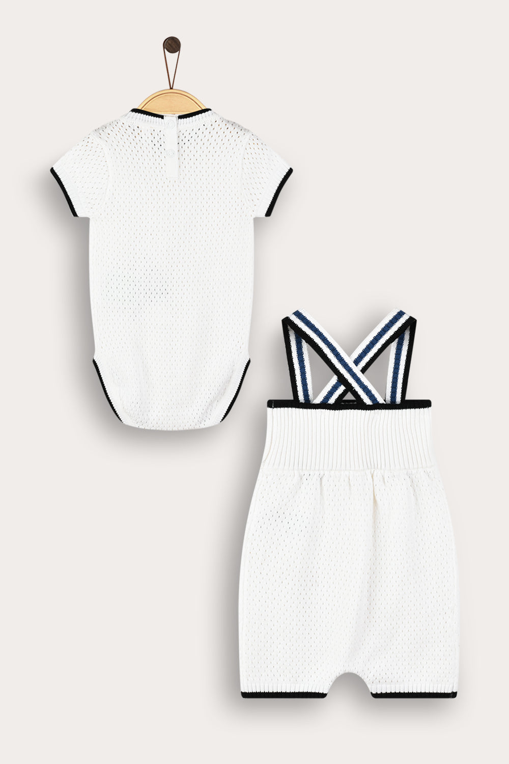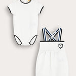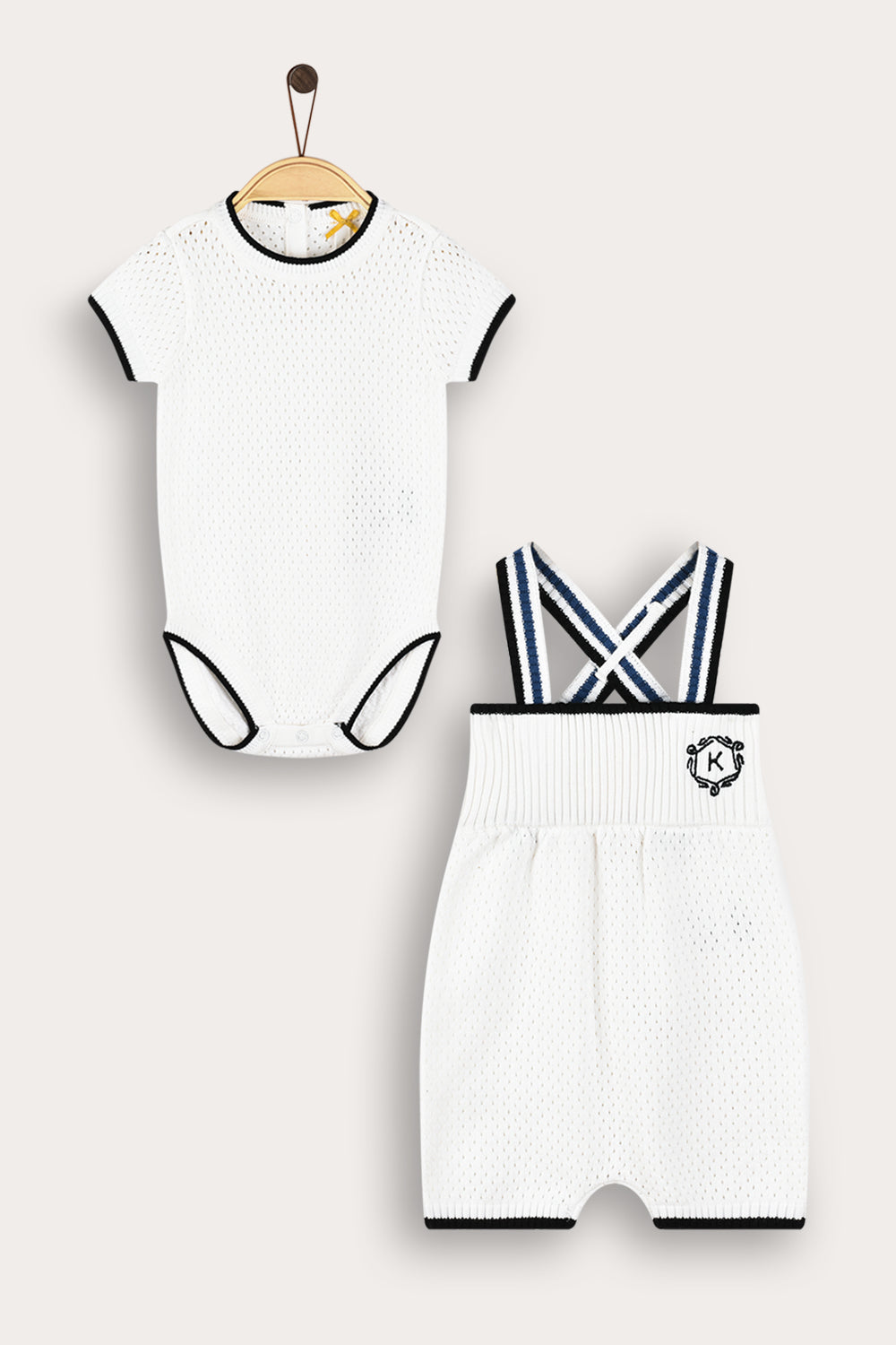 סט שני חלקים ייחודי ומוקפד לתינוק, עשוי מבד עם חורי אוורור קטנים - לנוחות מירבית לאורך היום. החלק העליון – סרבל כתפיות עם סמל רקמה צדדי וגימור פס ריב פסים, למראה אלגנטי ומסודר. החלק התחתון בגד גוף בעיצוב תואם המשלים הופעה חיננית ונקיה. אידיאלי לשבתות, חגים ואירועים משפחתיים.