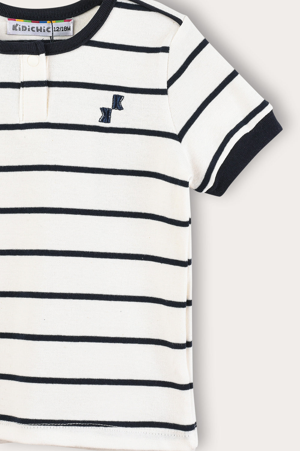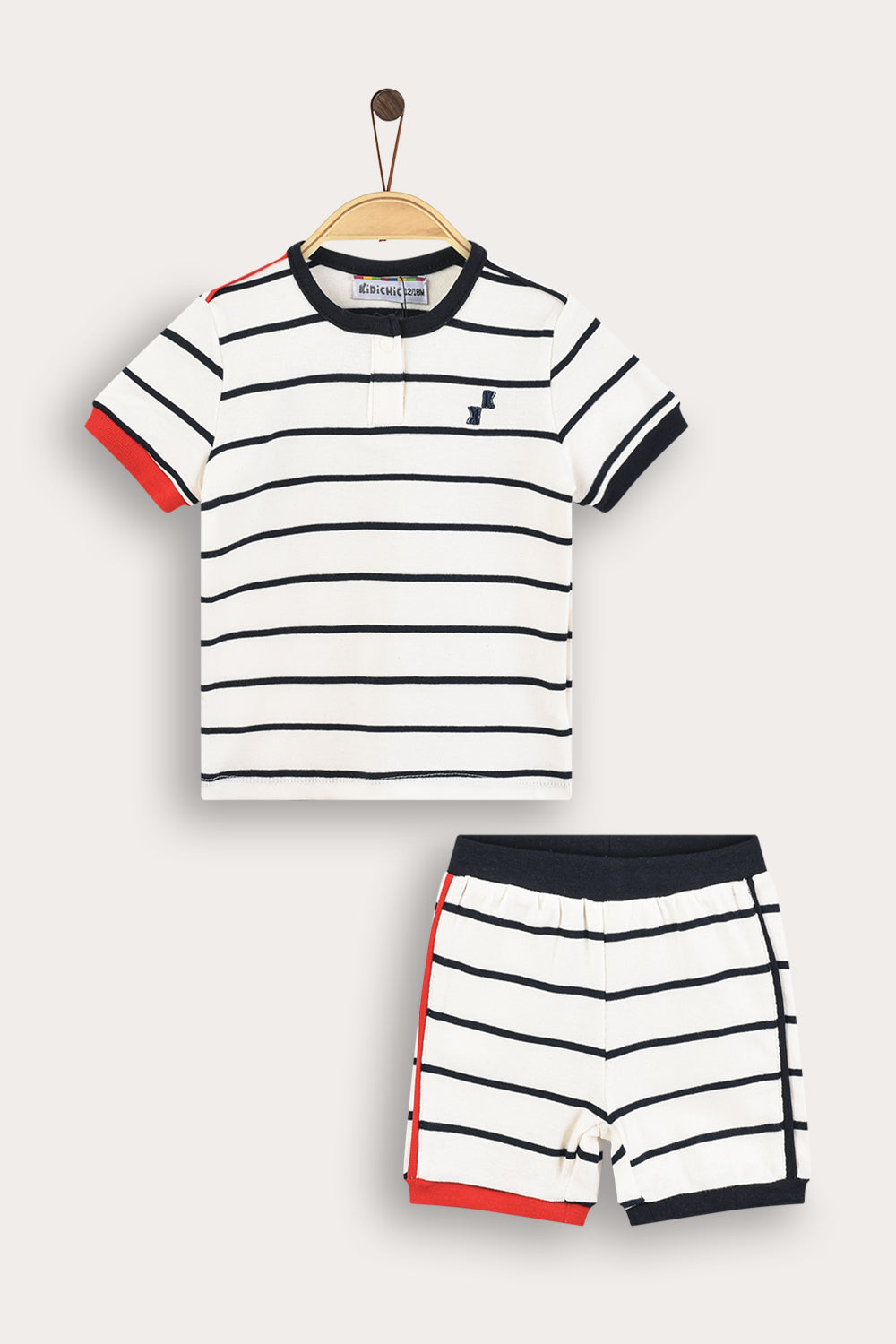 סט שני חלקים קייצי ונוח לתינוקות, בעיצוב יוניסקס המתאים לבנים ולבנות כאחד. עשוי מבד תערובת כותנה איכותי, בדוגמת פסים עם סיומת פס ריב למראה ספורטיבי ונעים. החלק העליון חולצת טי שירט עם רקמת סמל צדדית, שרוולים קצרים ופתח צוואר עגול בסגירת שני כפתורים. החלק התחתון מכנסיים קצרים בעיצוב תואם להשלמת הופעה מסודרת ומוקפדת.
