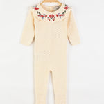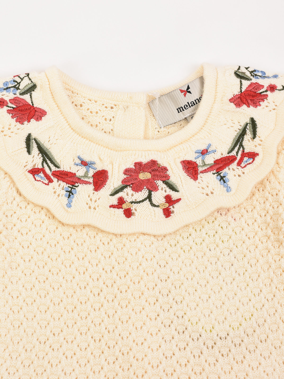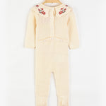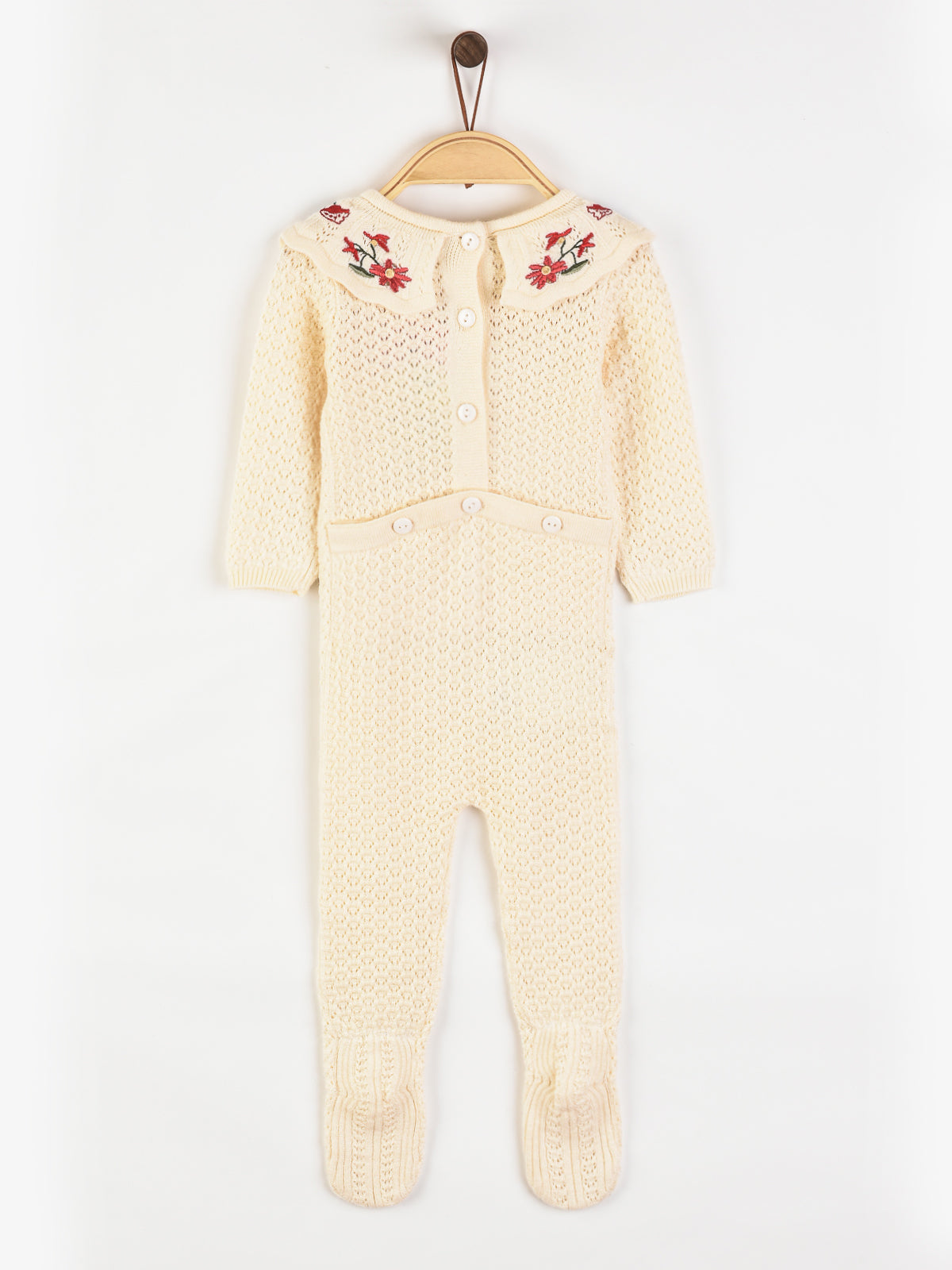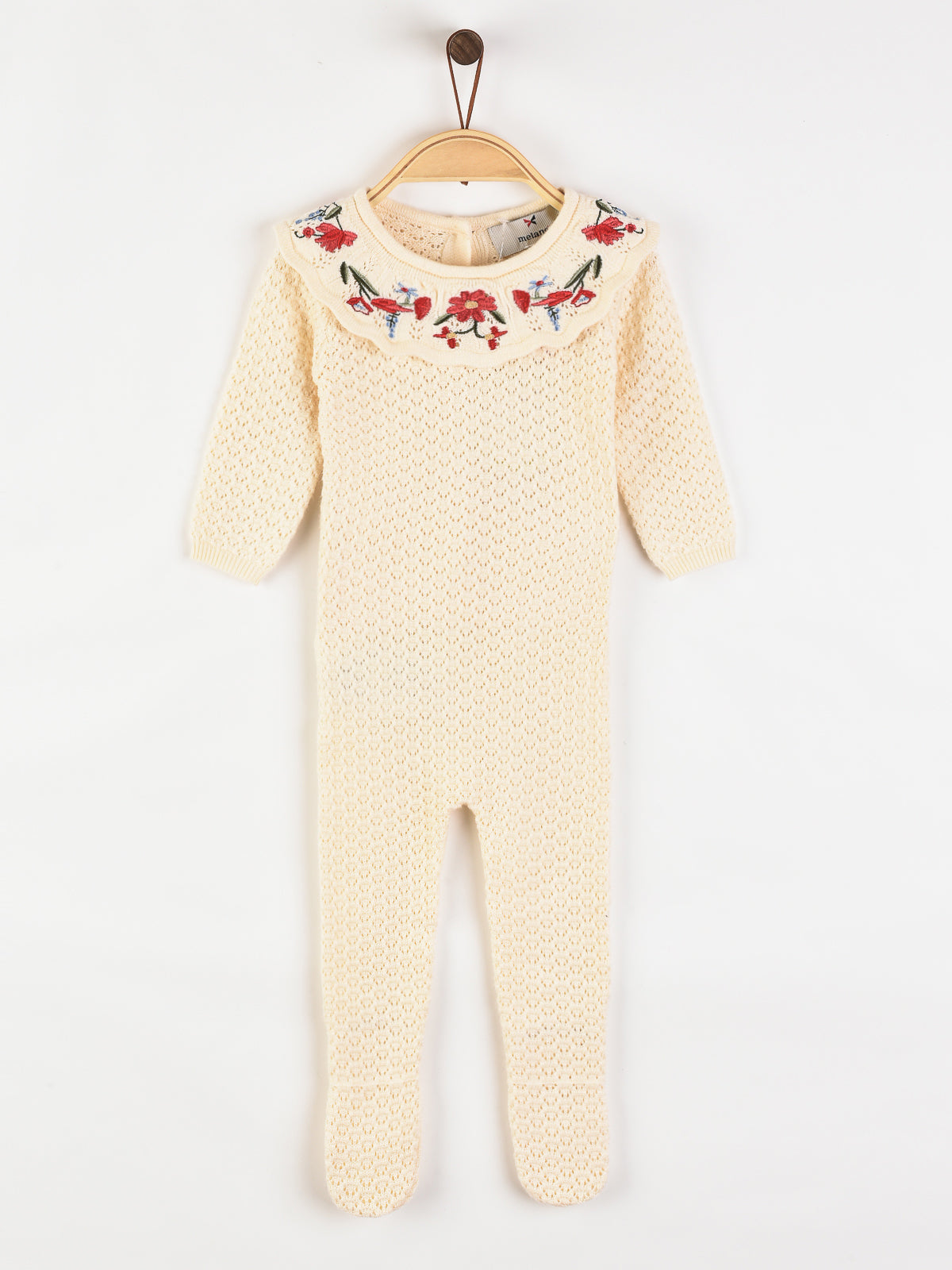 חליפת סריג לתינוקות, עם צווארון מעוגל ורקמת פרחים.