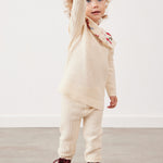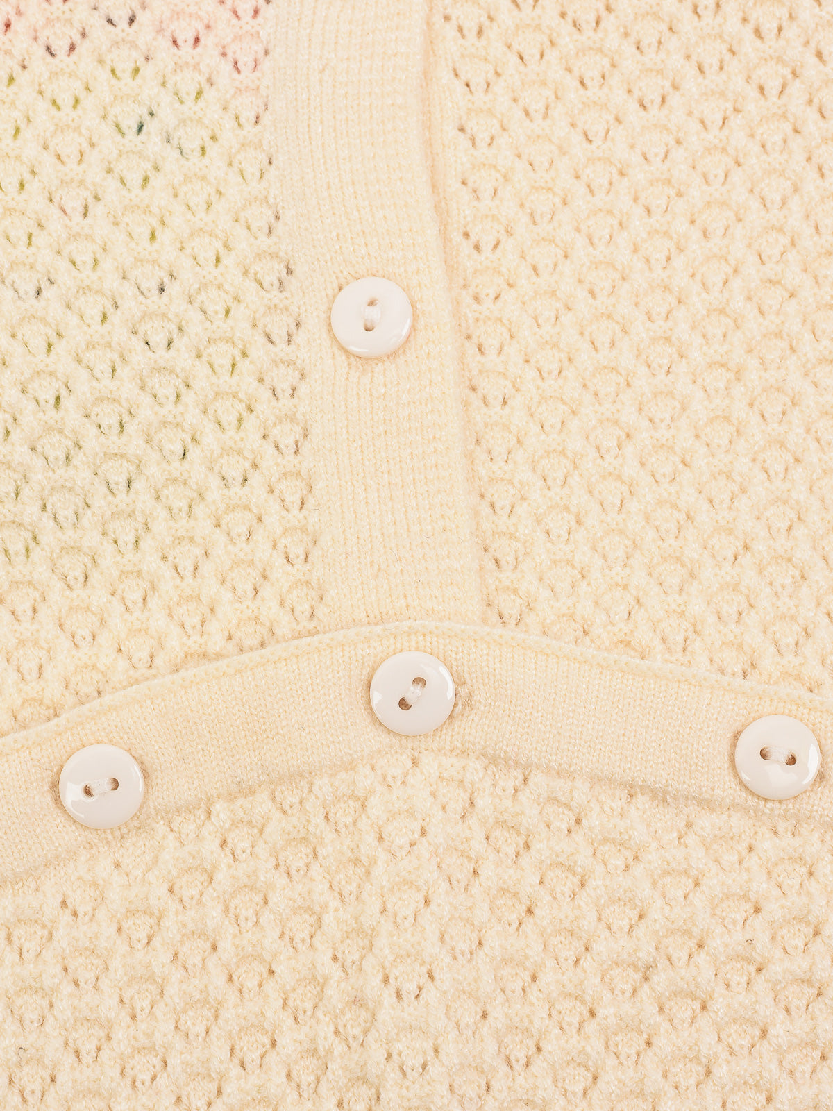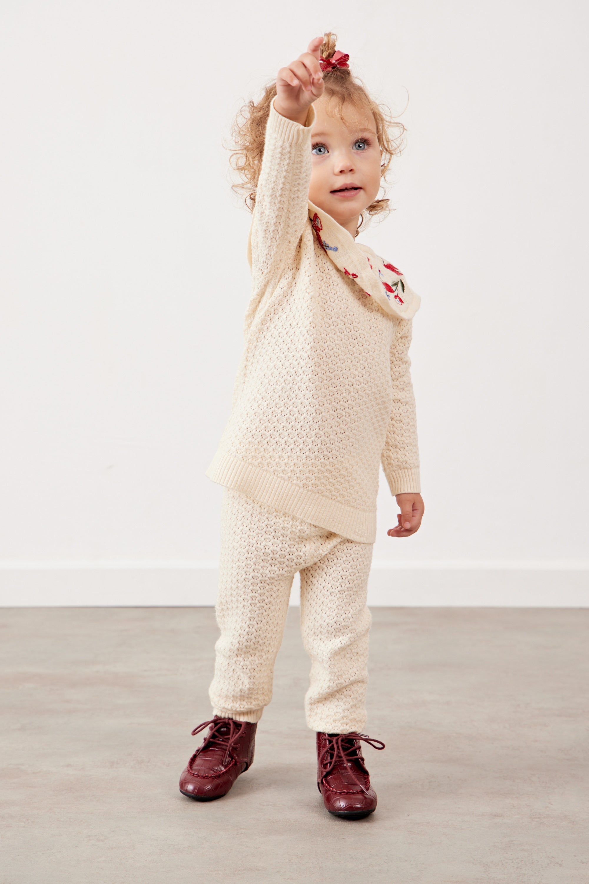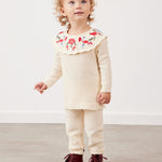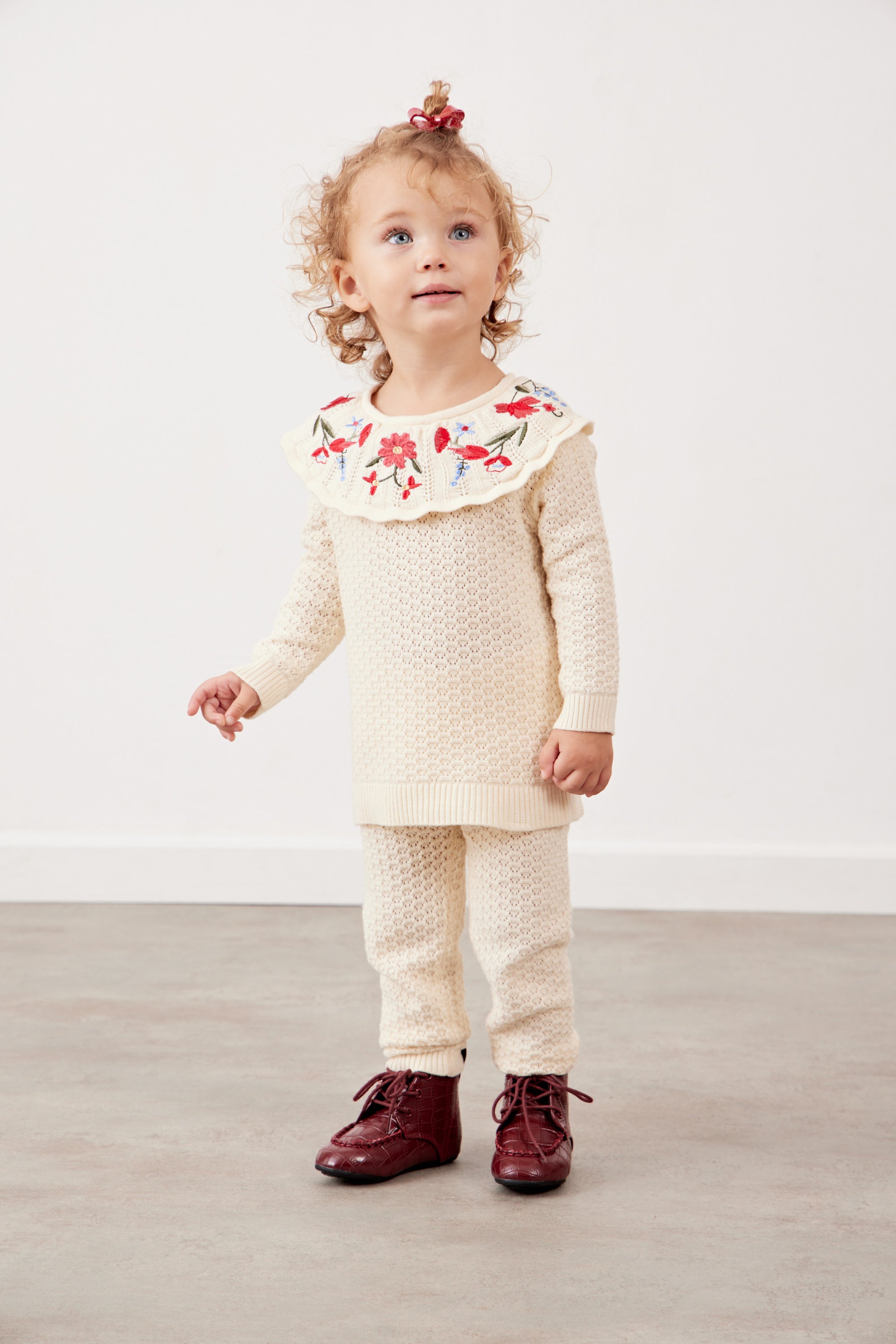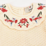 חליפת סריג לתינוקות, עם צווארון מעוגל ורקמת פרחים.