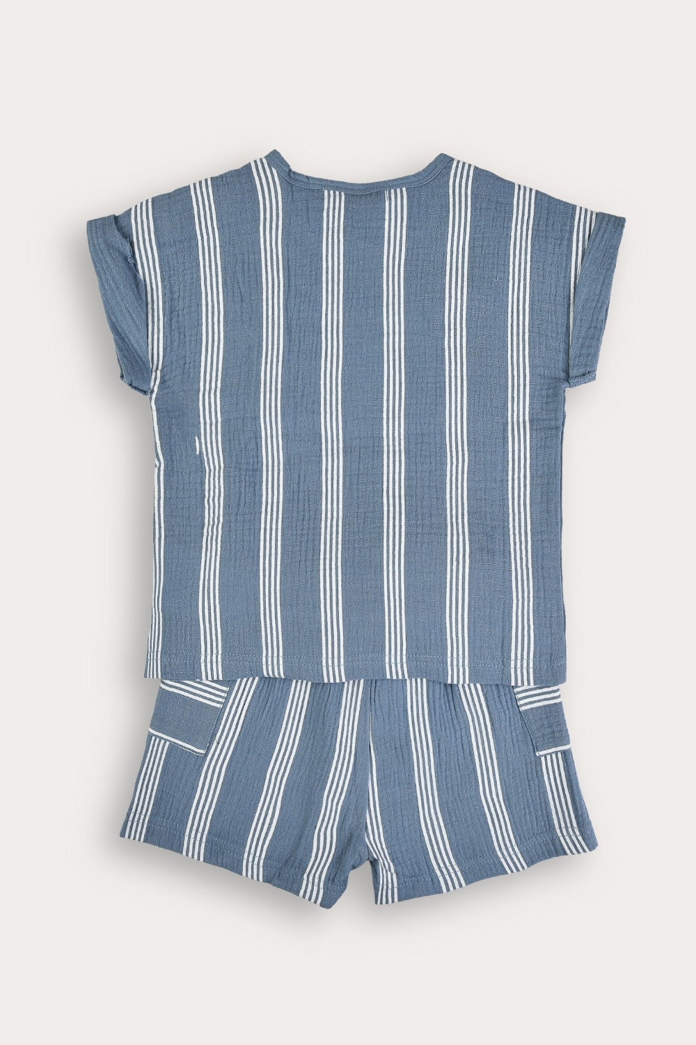 סט שני חלקים לתינוקות בעיצוב יוניסקס המתאים לבנים ולבנות כאחד. עשוי מבד כותנה איכותי ונושם - לנוחות מירבית לאורך כל היום. החלק העליון חולצה עם שרוולים קצרים בסיומת קפל, ושלושה כפתורים בכתף - להלבשה מהירה וקלה. החלק התחתון מכנסים קצרים בעיצוב תואם - להשלמת הופעה נקיה ומסודרת.