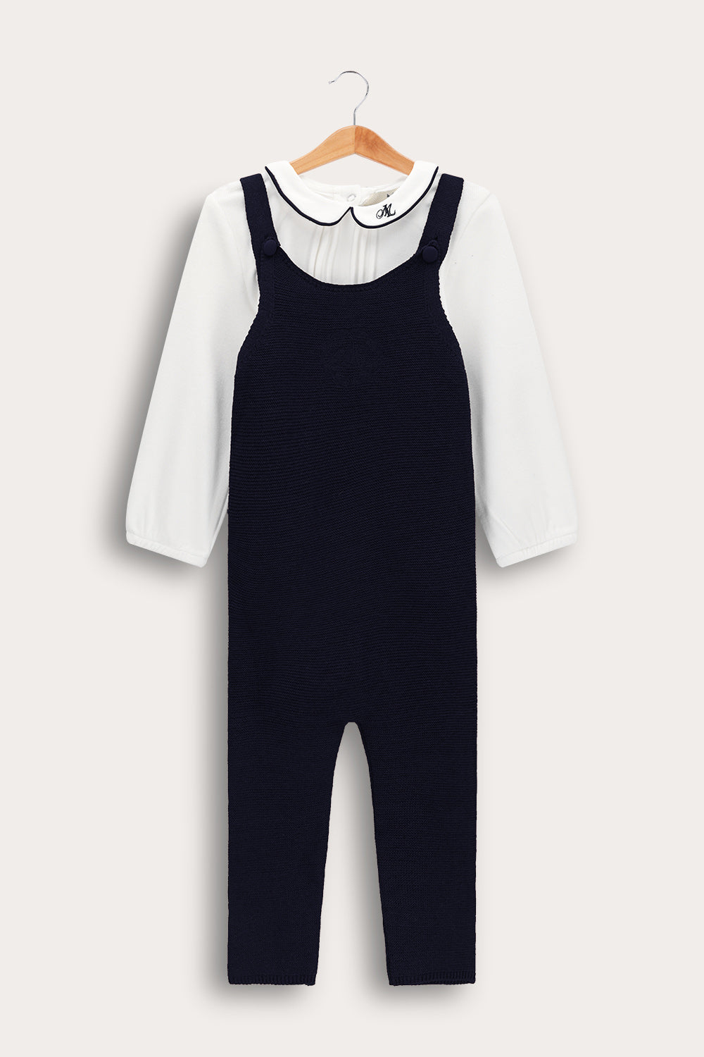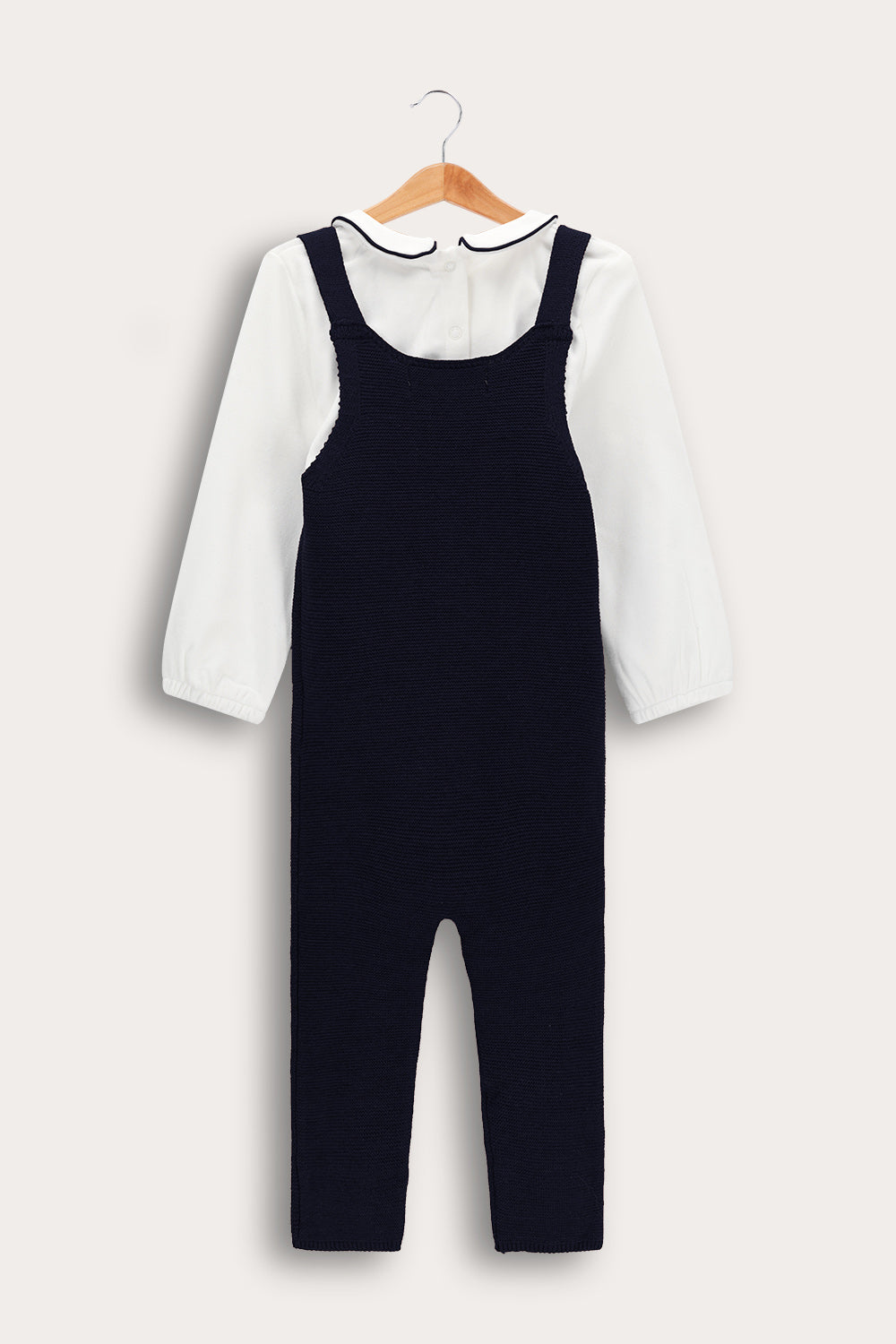 בגד גוף עם צווארון רקמה, וסרבל כתפיות בשילוב כפתורים.