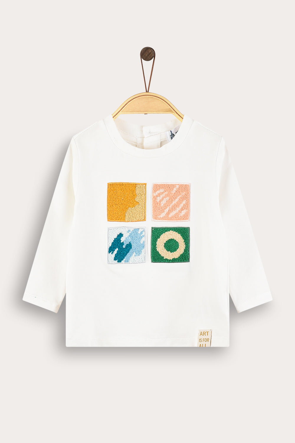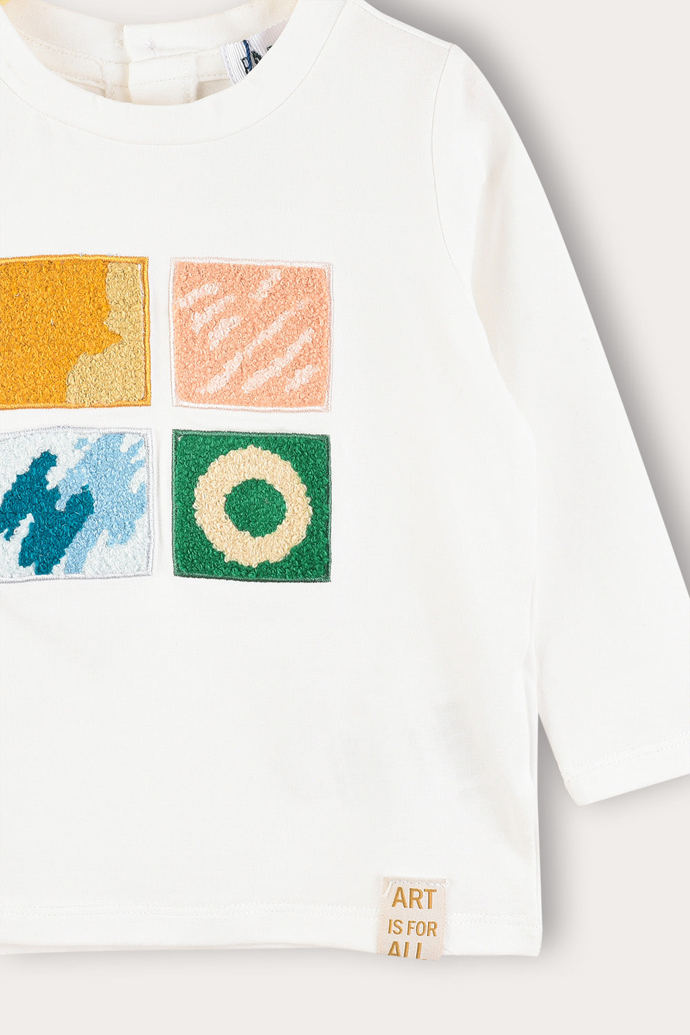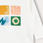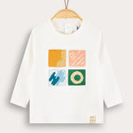 חולצה אופנתית לתינוקת, עם שרוולים ארוכים, פתח צוואר עגול ואפליקציית ריבועים קדמית במוטיב של גלריה.