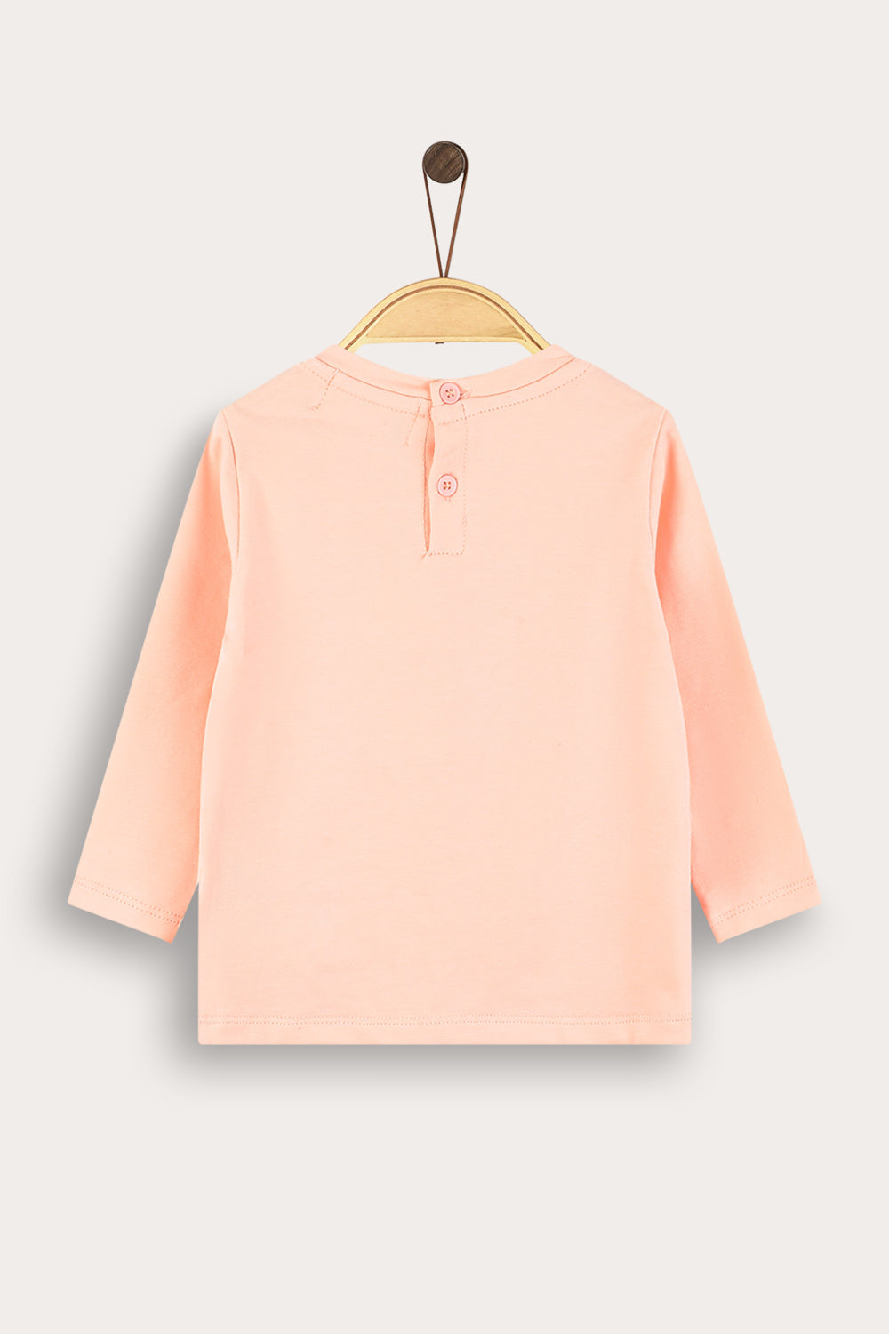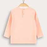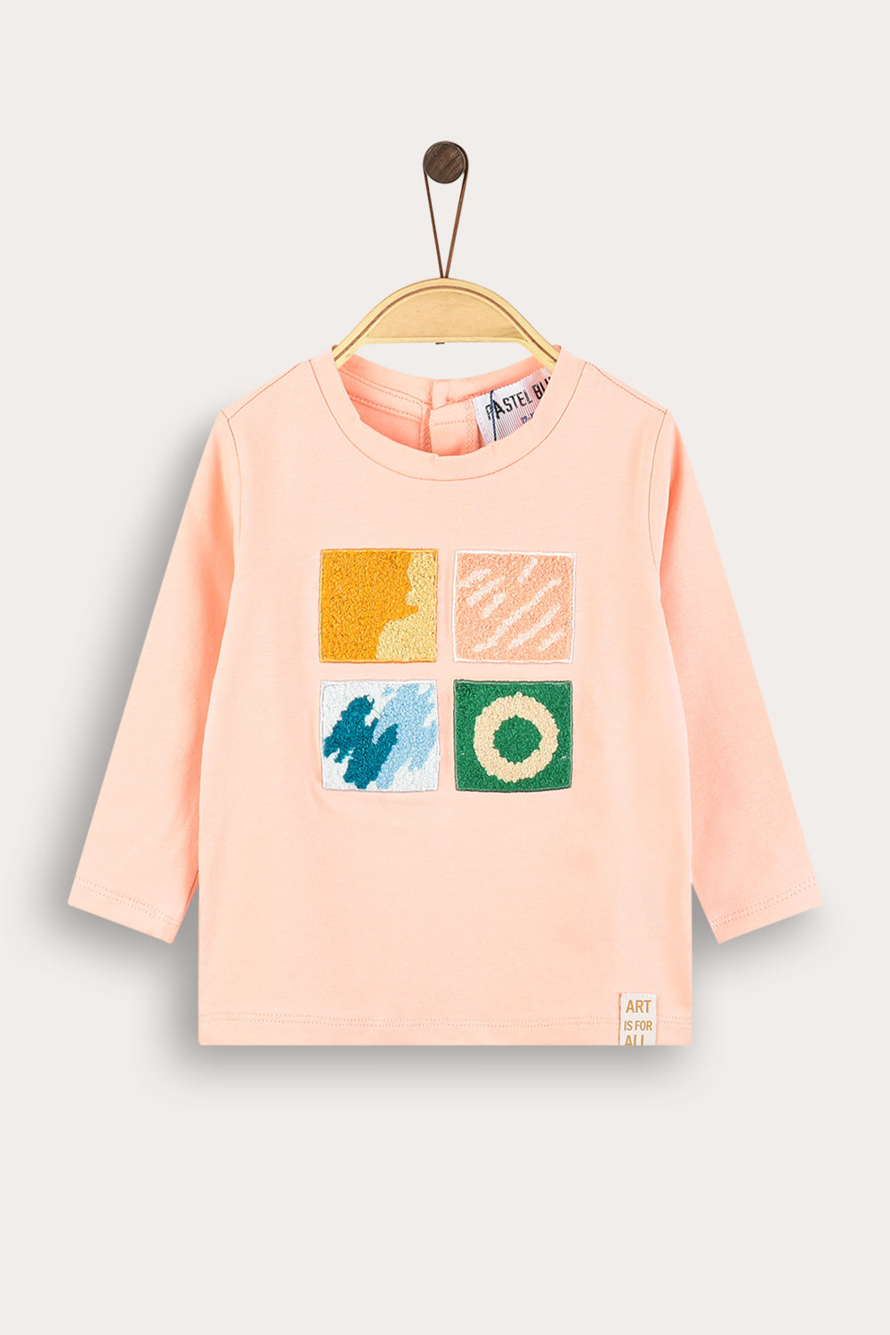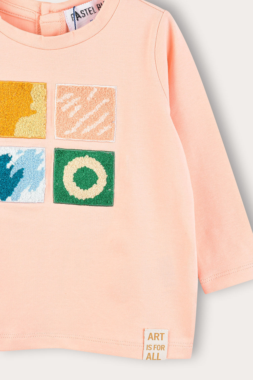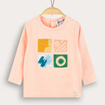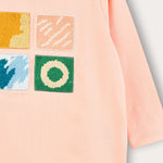 חולצה אופנתית לתינוקת, עם שרוולים ארוכים, פתח צוואר עגול ואפליקציית ריבועים קדמית במוטיב של גלריה.