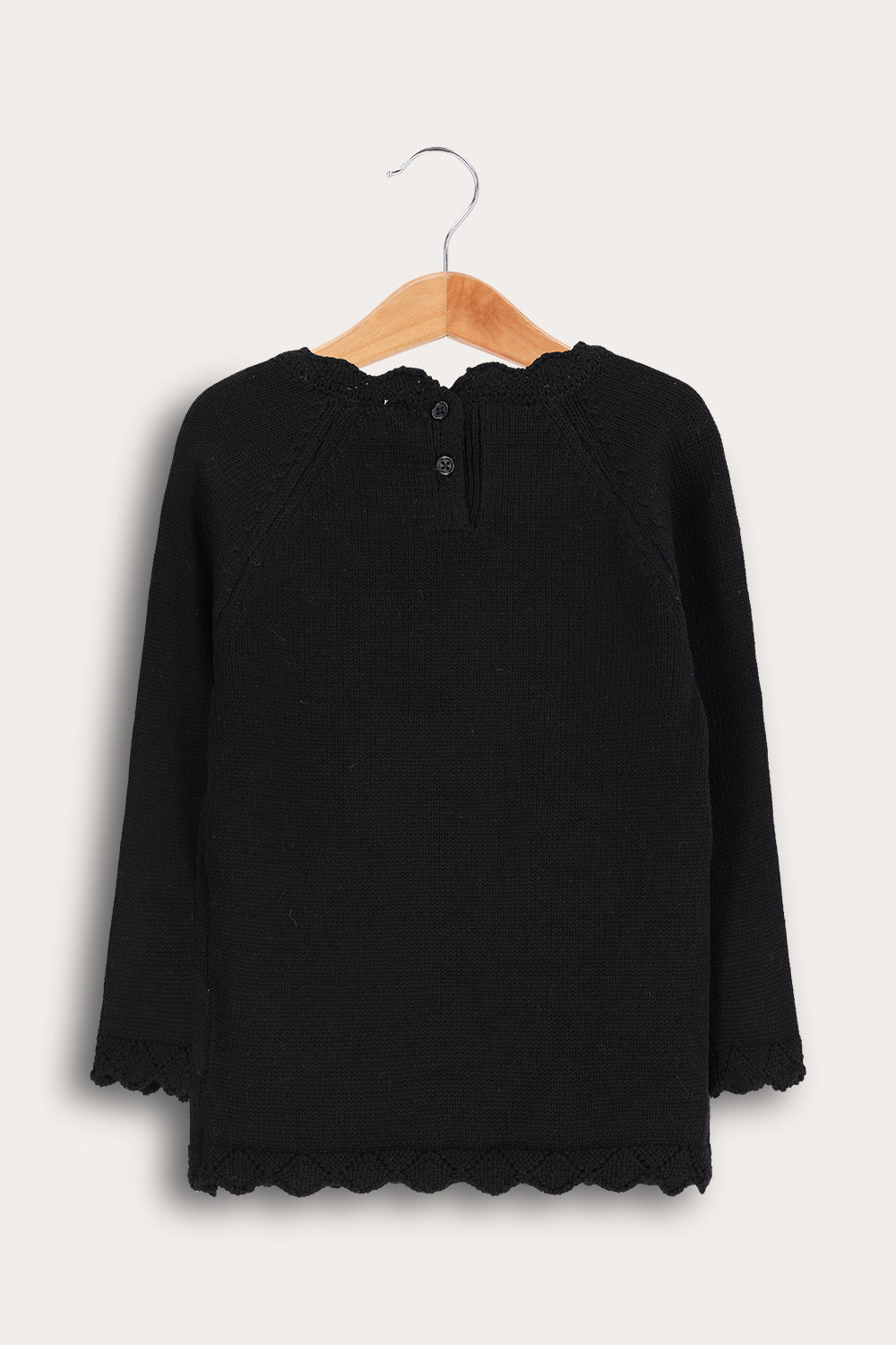 סוודר שבת חגיגי לתינוקת, עם רקמת פפיונים וסיומת סרוגה במראה תחרה.