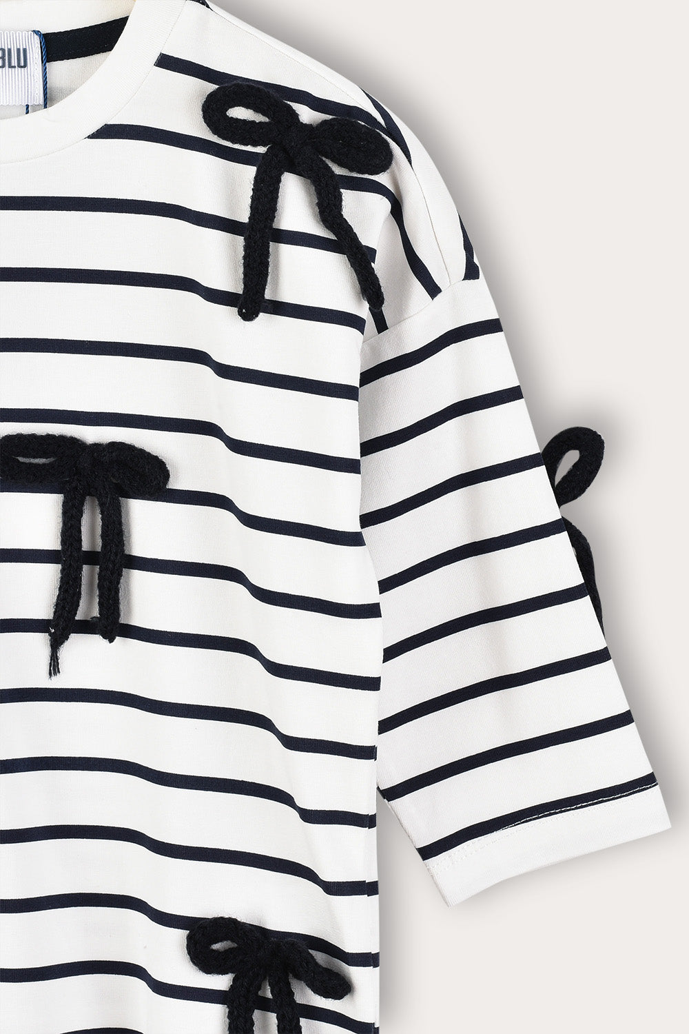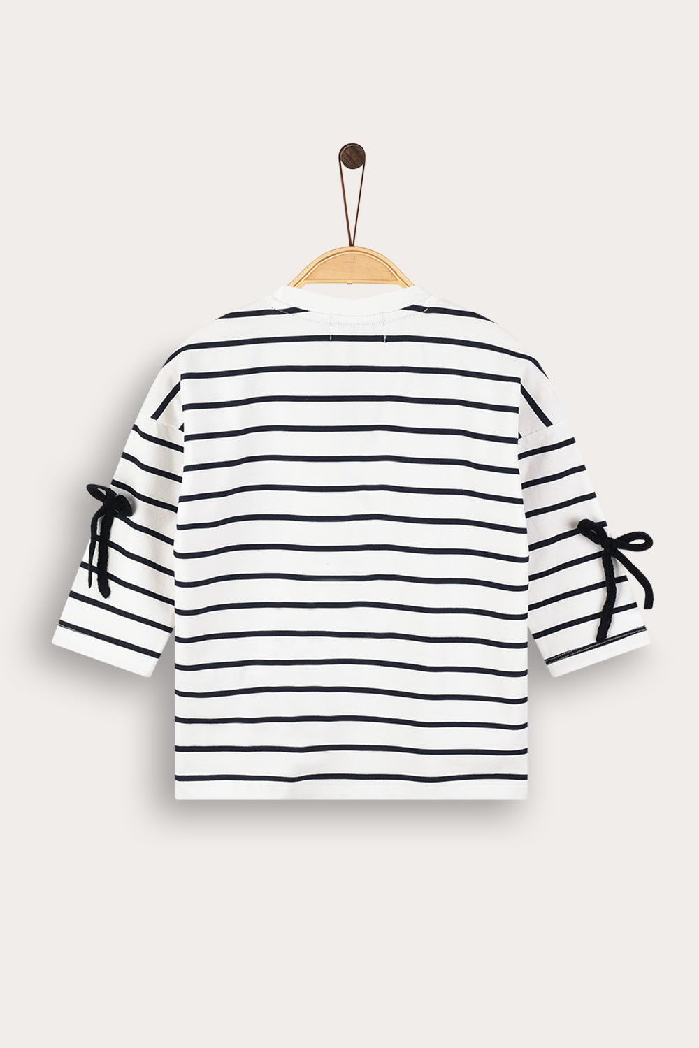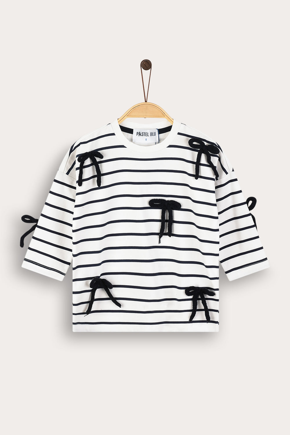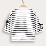 חולצת טי שירט לבנות, בעיצוב אופנתי וייחודי, עשויה מבד תערובת כותנה איכותי ונושם לנוחות מירבית לאורך כל היום. הגזרה כוללת פתח צוואר עגול ושרוולים פרקטיים באורך 3/4. הדפס פסים וקישוטי סרטי פפיונים - משלימים הופעה חיננית ועדכנית, בחירה מושלמת לשילוב עם חצאיות ולמראה מתוק ומסודר.