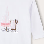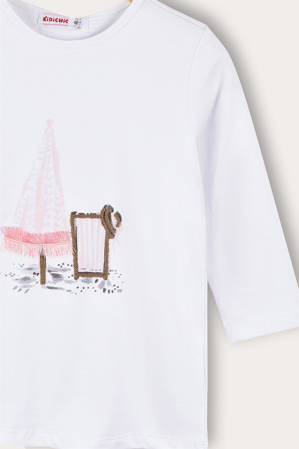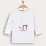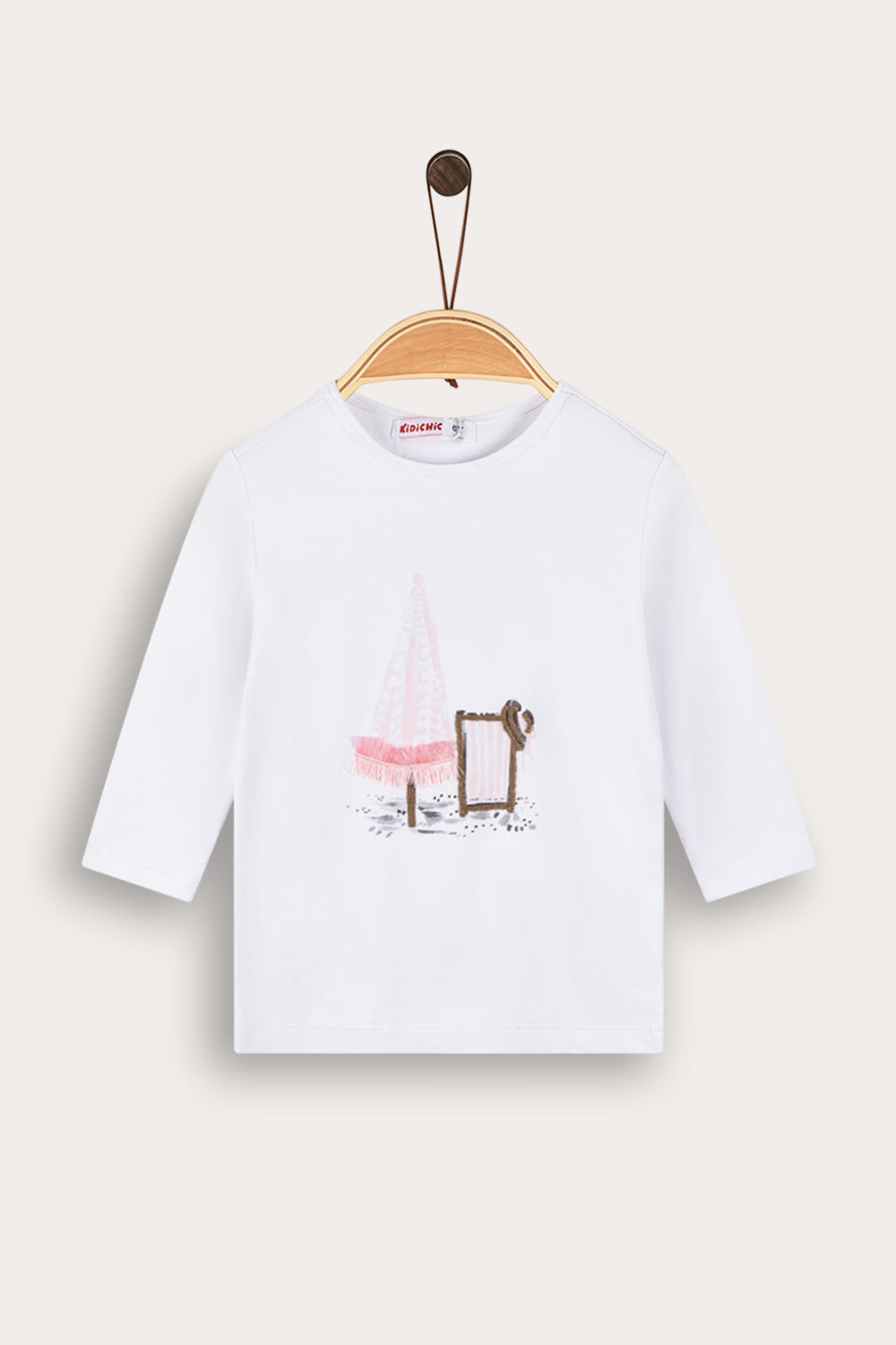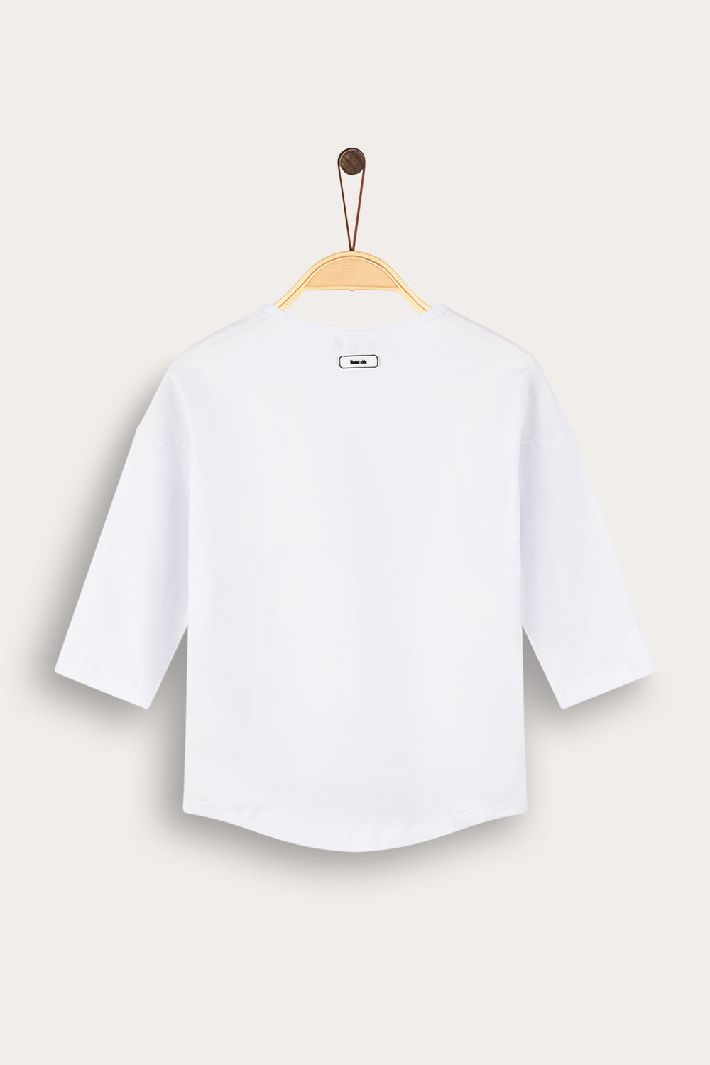 חולצה לבנה לבנות, עשויה מבד מודל תערובת כותנה, איכותי ונושם. הגזרה כוללת שרוולים באורך 3/4 ופתח צוואר עגול להתאמה ונוחות מירבית. הדפס שמשייה צבעוני ומחויך, מספק מראה רענן וקיצי. מתאימה לשימוש יומיומי ולטיולים משפחתיים.