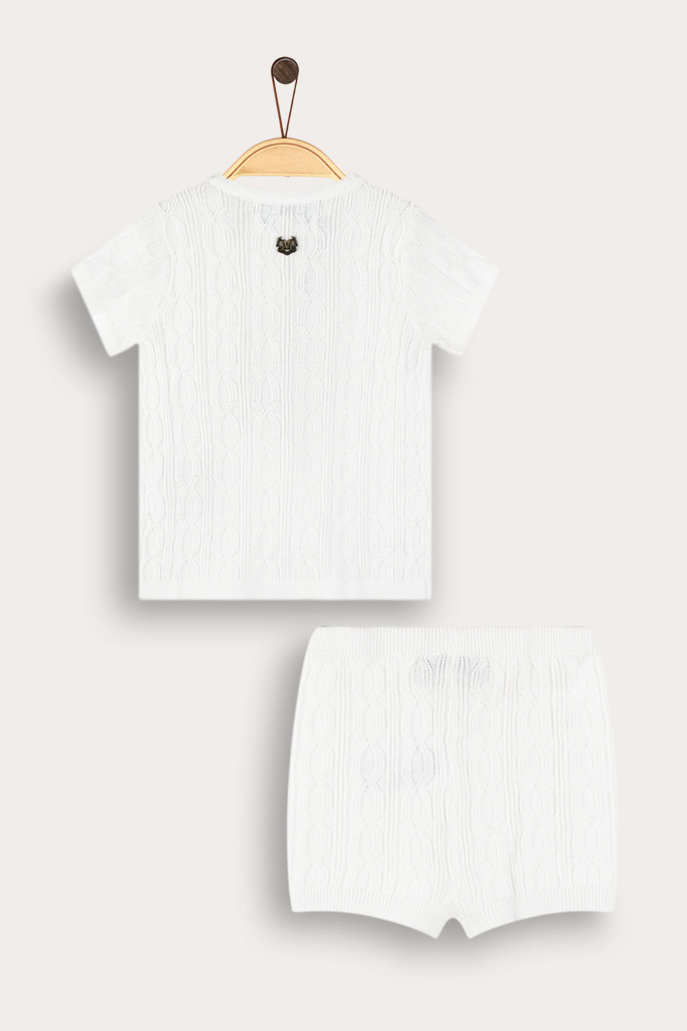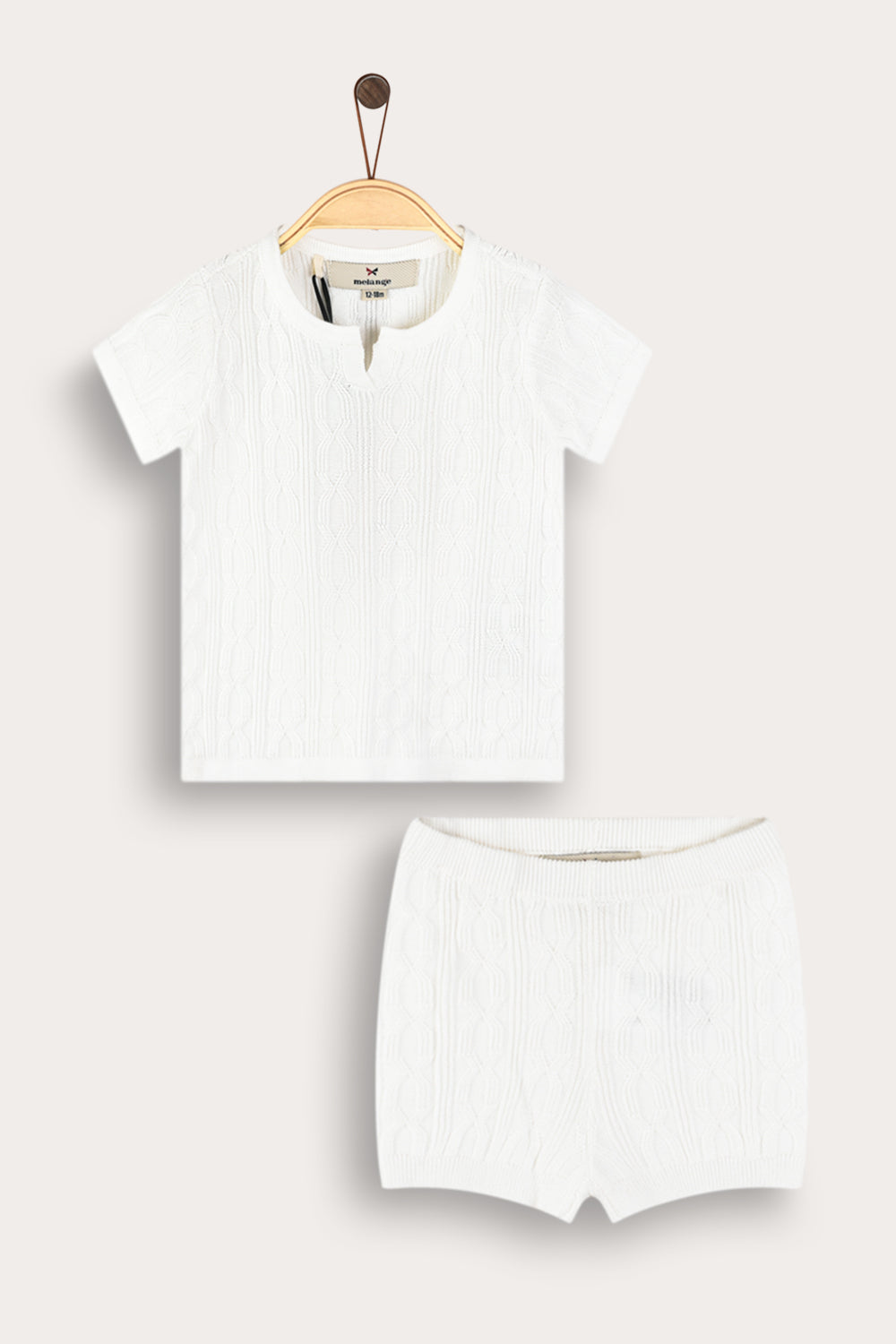 סט נעים ומוקפד לתינוק, הכולל שני חלקים בעיצוב נקי וקלאסי. עשוי בד סריג דק ונעים עם דוגמת לולאות, מתערובת כותנה איכותית - המעניק נוחות מרבית לאורך כל היום. החלק העליון - חולצה עם שרוולים קצרים, מגיע עם מכנסיים קצרים תואמים, בגוון חלק ואחיד. בחירה מושלמת להופעה מסודרת ומרשימה, אידיאלית לשבתות, חגים ויציאות משפחתיות.