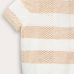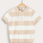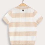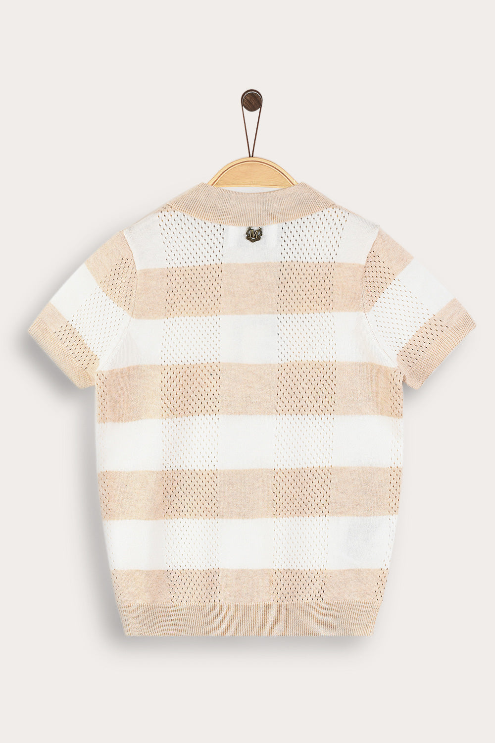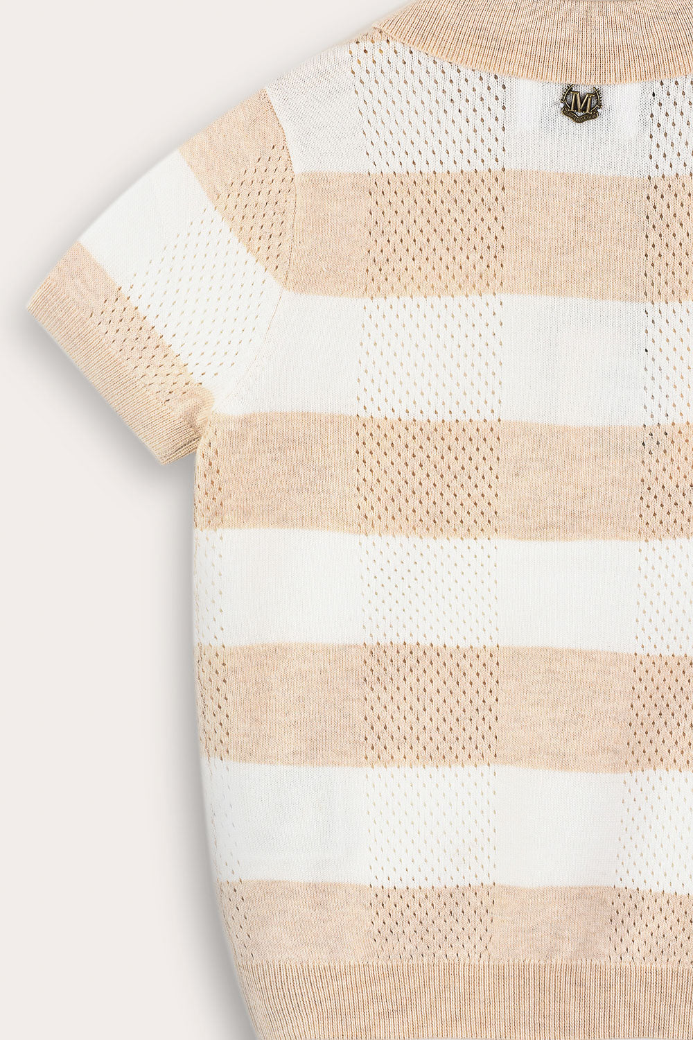 חולצת בנים בעיצוב קלאסי ונעים, עשויה מבד סריג אלסטי וגמיש, עם חורים קטנים - לאוורור קל ונוחות מירבית לאורך היום. הגזרה כוללת שרוולים קצרים ופתח צוואר וי עם צווארון - להופעה מחמיאה ומסודרת. דוגמת משבצות עדינה וסמל רקמה קדמי - משלימים מראה עשיר ומוקפד, המתאים לשבתות ולאירועים חגיגיים.