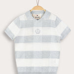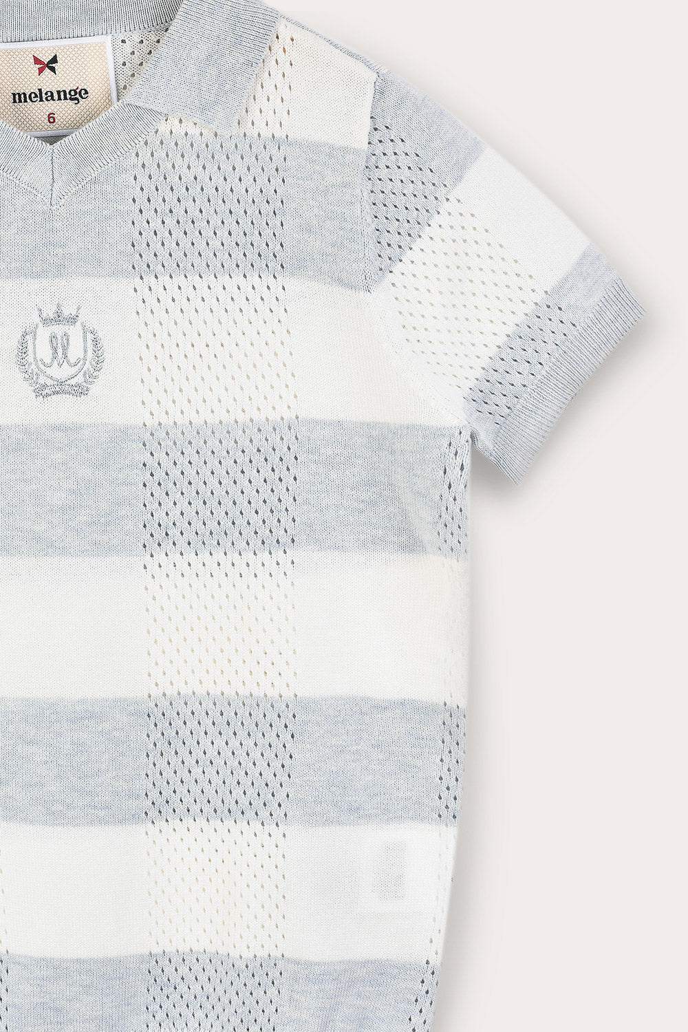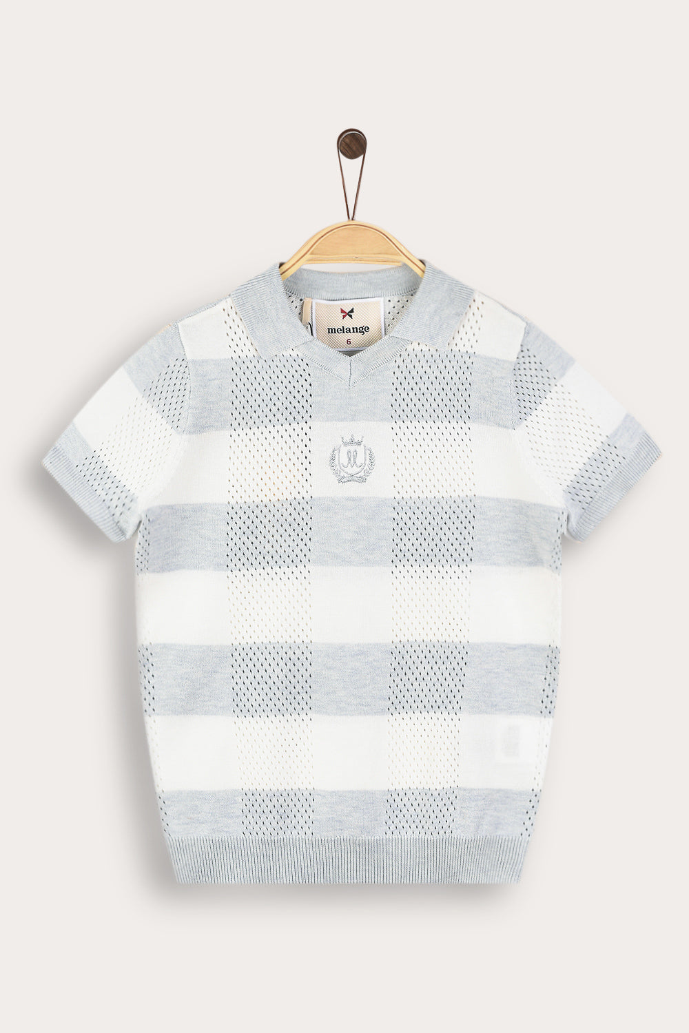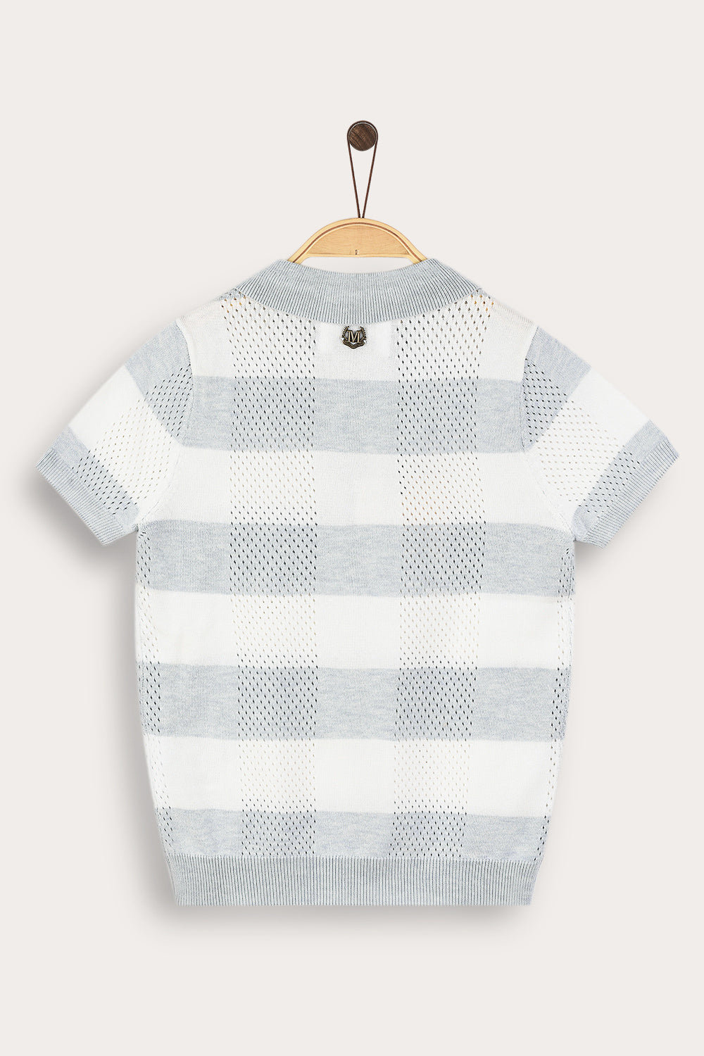 חולצת בנים בעיצוב קלאסי ונעים, עשויה מבד סריג אלסטי וגמיש, עם חורים קטנים - לאוורור קל ונוחות מירבית לאורך היום. הגזרה כוללת שרוולים קצרים ופתח צוואר וי עם צווארון - להופעה מחמיאה ומסודרת. דוגמת משבצות עדינה וסמל רקמה קדמי - משלימים מראה עשיר ומוקפד, המתאים לשבתות ולאירועים חגיגיים.
