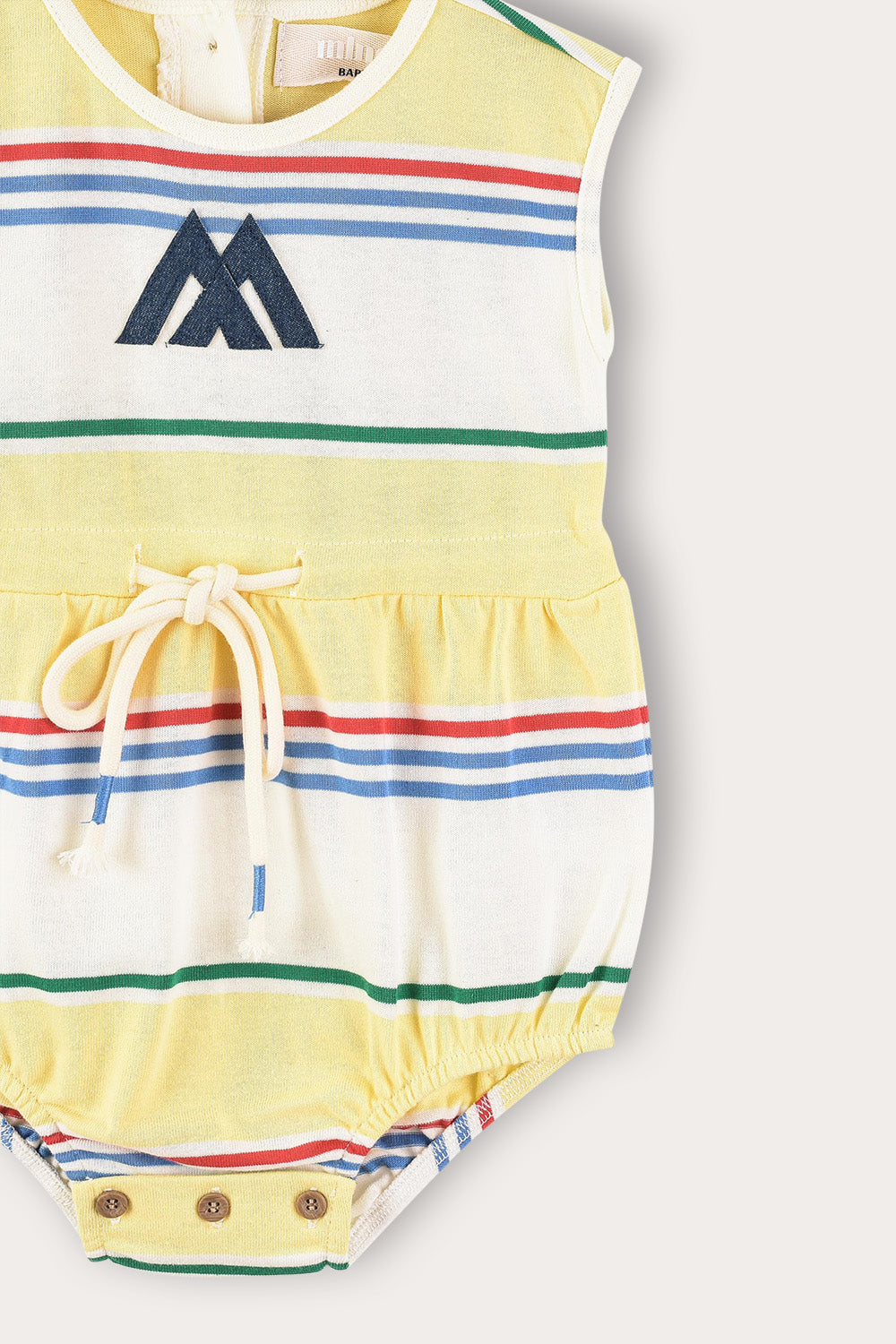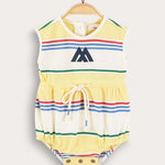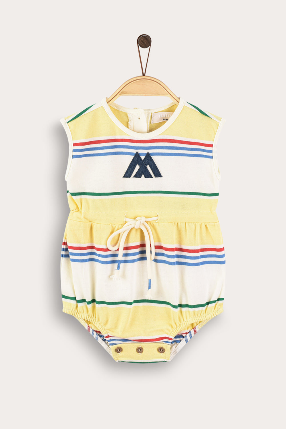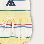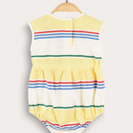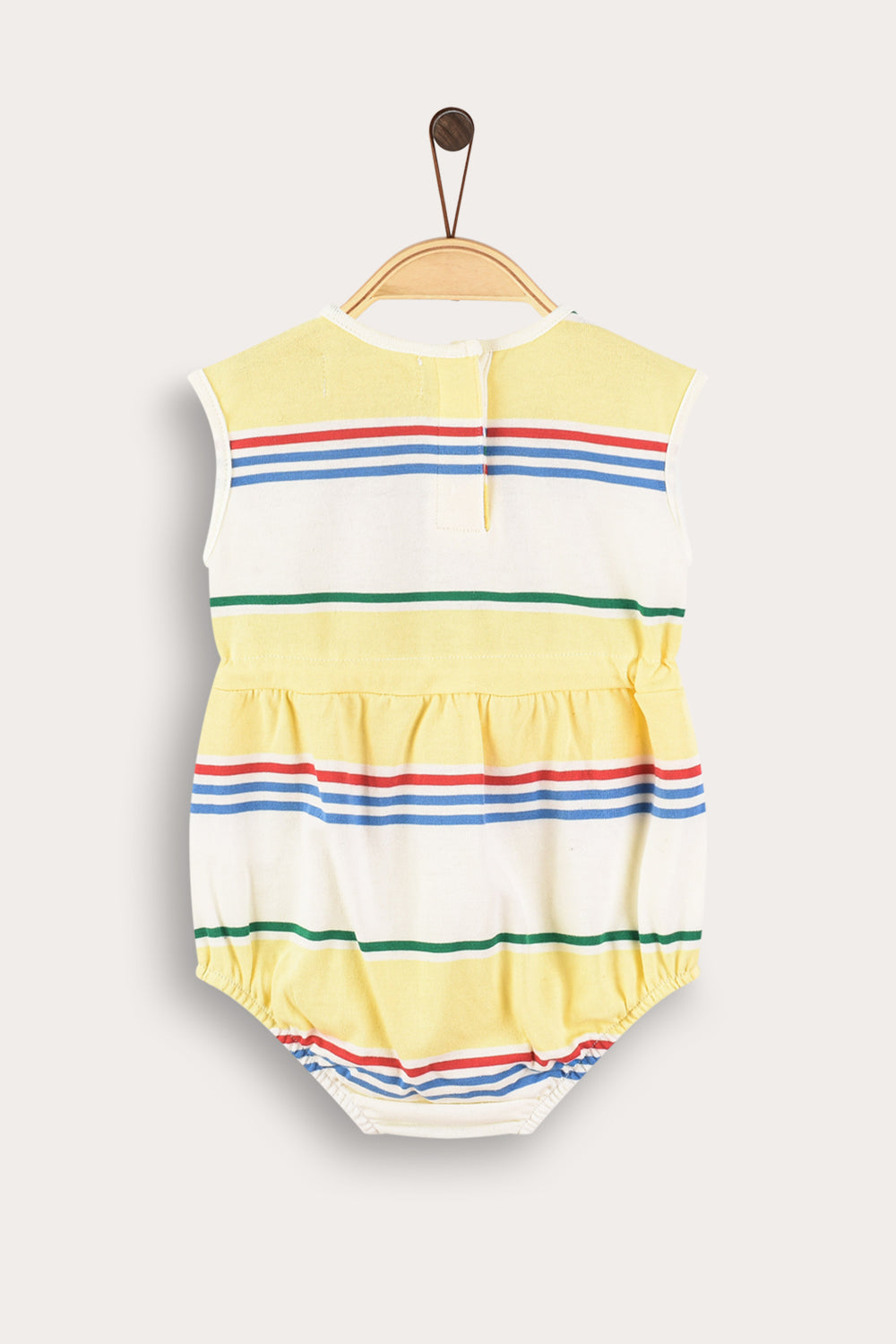 אוברול קייצי ומתוק לתינוקת, בהדפס פסים בסגנון רטרו וסמל קדמי מלא סטייל.