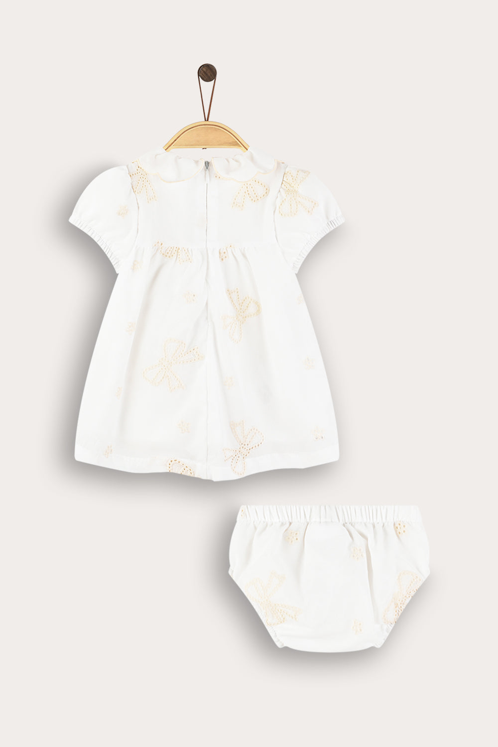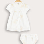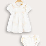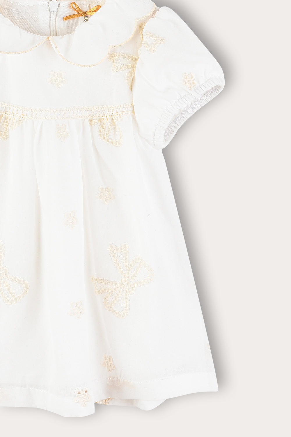 שמלה חגיגית לתינוקת, עשויה מבד כותנה נעים ונושם - לנוחות מירבית לאורך כל היום. הגזרה כוללת כיווצים ליצירת נפח מחמיא, צווארון מעוגל, שרוולים נפוחים וסגירת רוכסן בגב הבגד - להלבשה מהירה וקלה. רקמת פפיונים עדינה ועיטור סרט - משלימים הופעה מתוקה ומסודרת, אידיאלית לשבתות, חגים ואירועים משפחתיים.