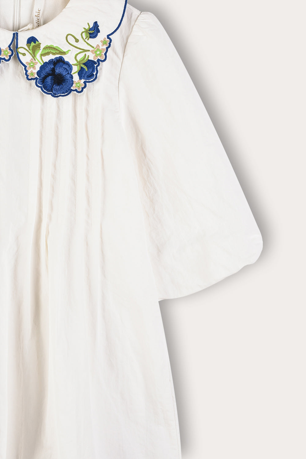 שמלת שבת מרשימה לבנות, במראה אלגנטי ומוקפד. הגזרה כוללת קפלים אנכיים בחלק הקדמי, ושרוולים רחבים. צווארון מעוצב עם רקמת פרחים ייחודית הופך את השמלה לפריט חגיגי ומרשים.