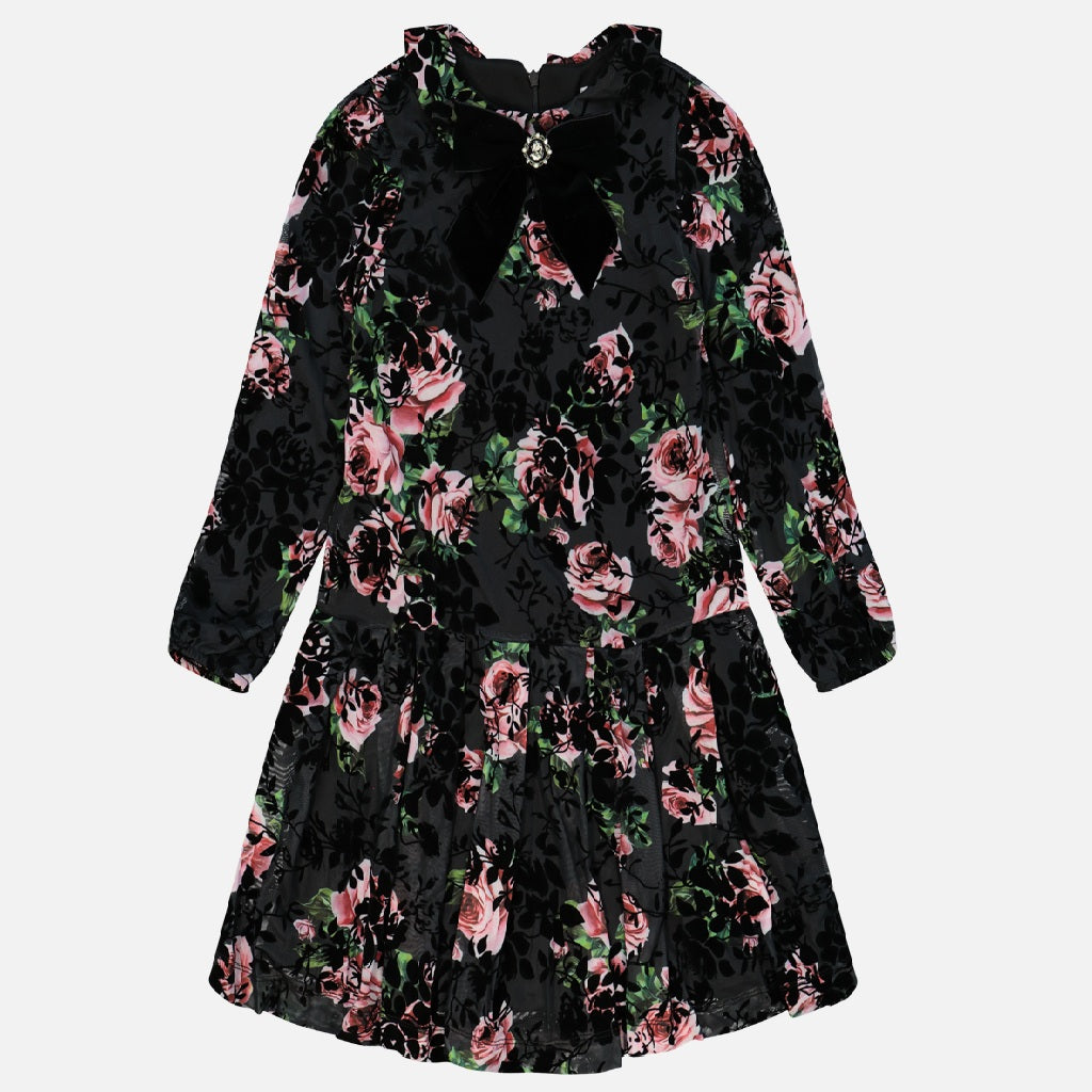 שמלה פרחונית עם צווארון קטיפה - אפור
