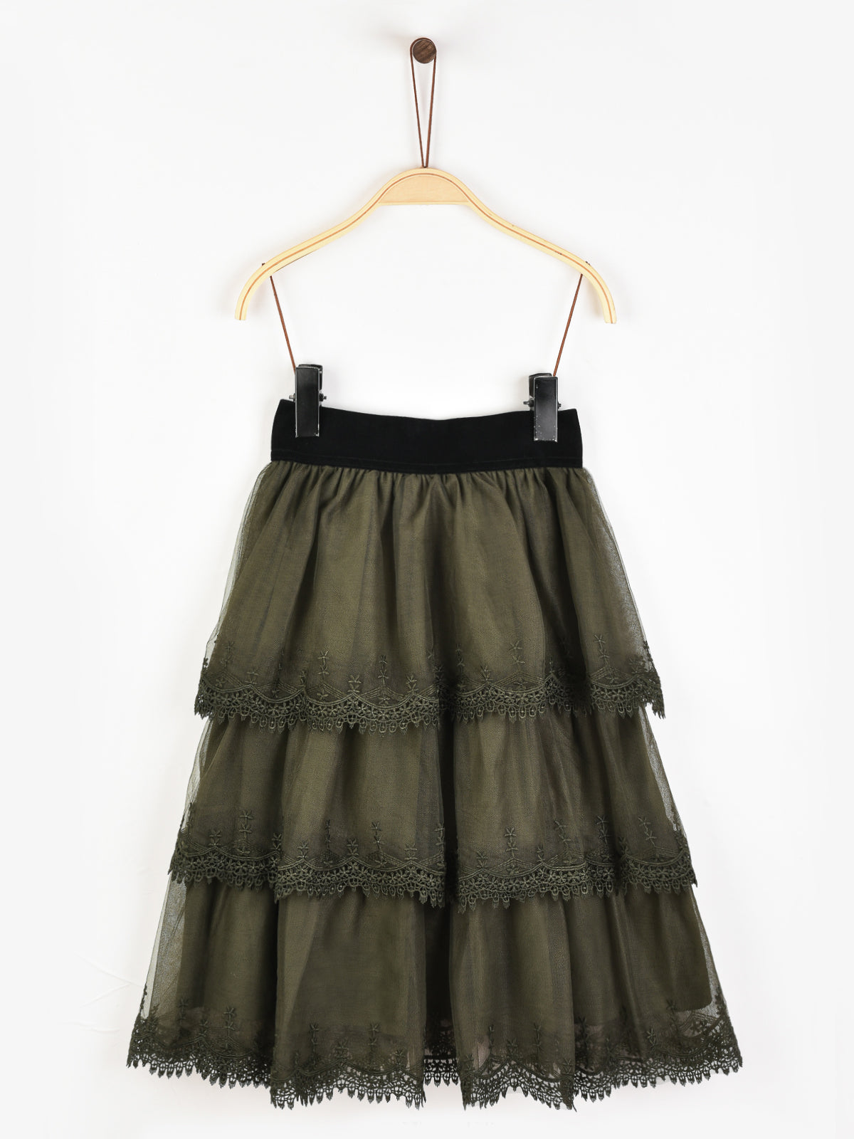 חצאית קומות סיומת תחרה - זית