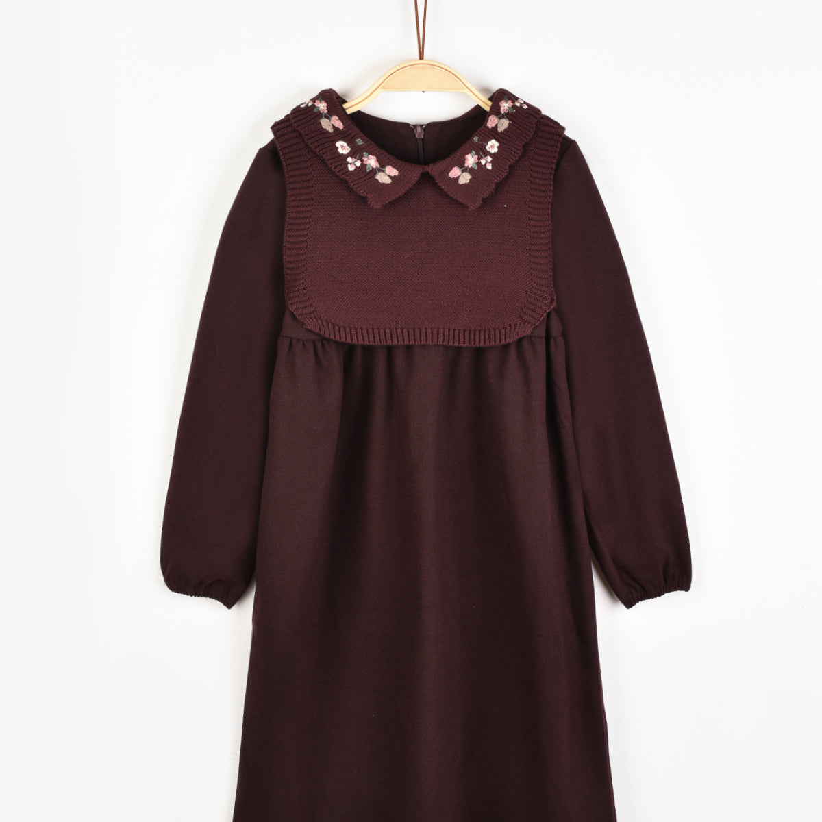 שמלה פרחונית עם צווארון קטיפה - בורדו