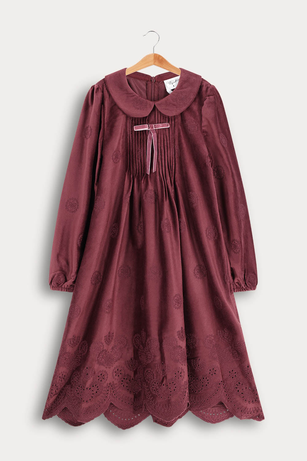 שמלת קטיפה עם רקמת פרחים - בורדו