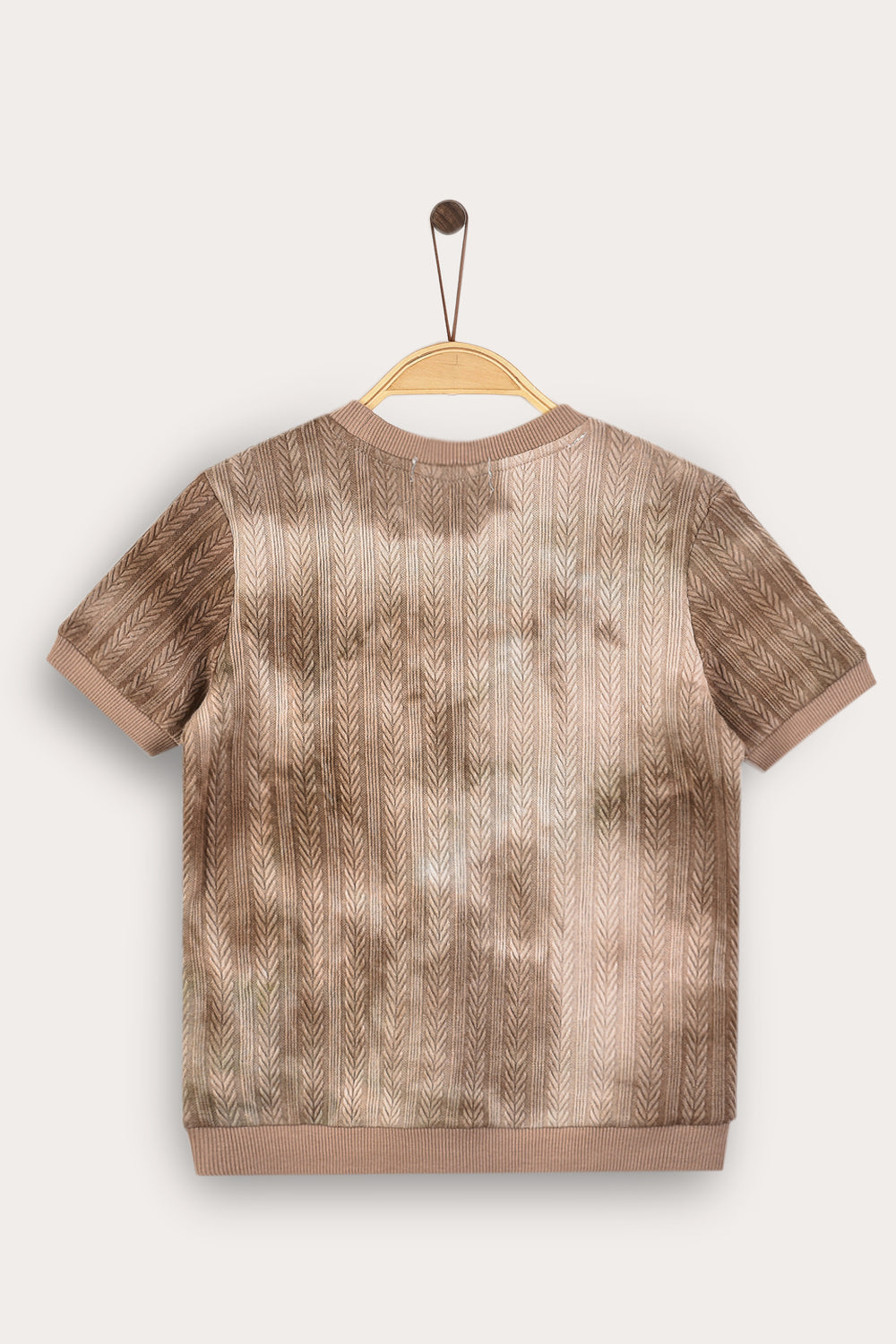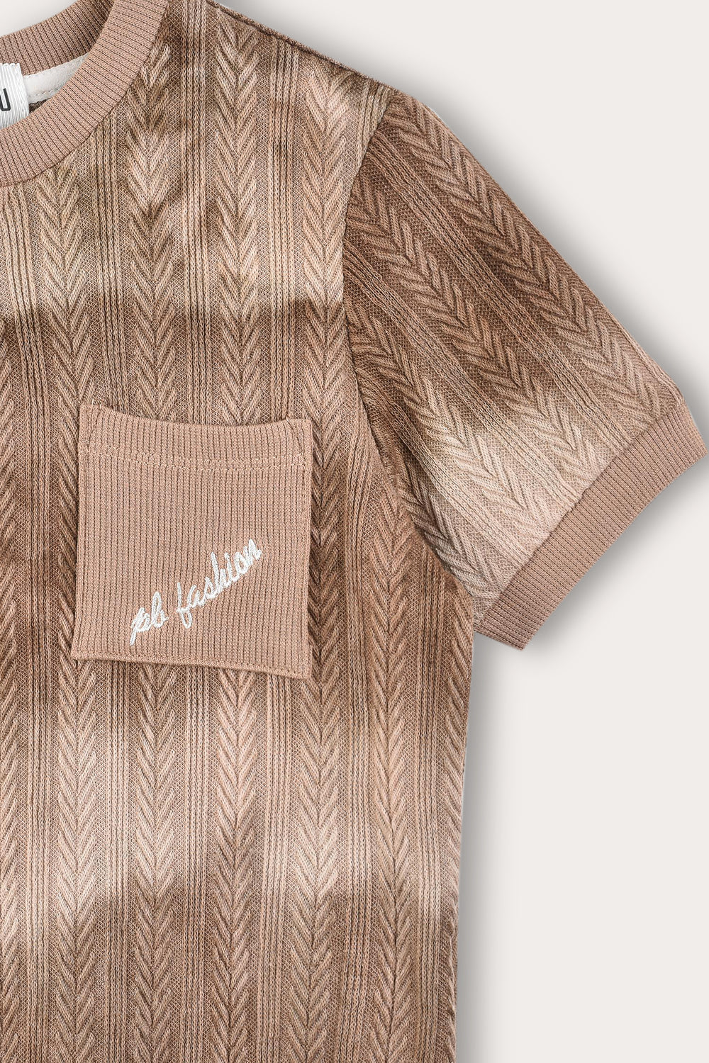 A fashionable boys' shirt in a tie-dye design with a unique look. Made of a flexible and comfortable knit fabric with a delicate braid pattern. The cut includes short sleeves, a round neckline, a neat ribbed finish for maximum fit and a side pocket with embroidery - completing a practical and meticulous appearance. Suitable for everyday use and family outings.