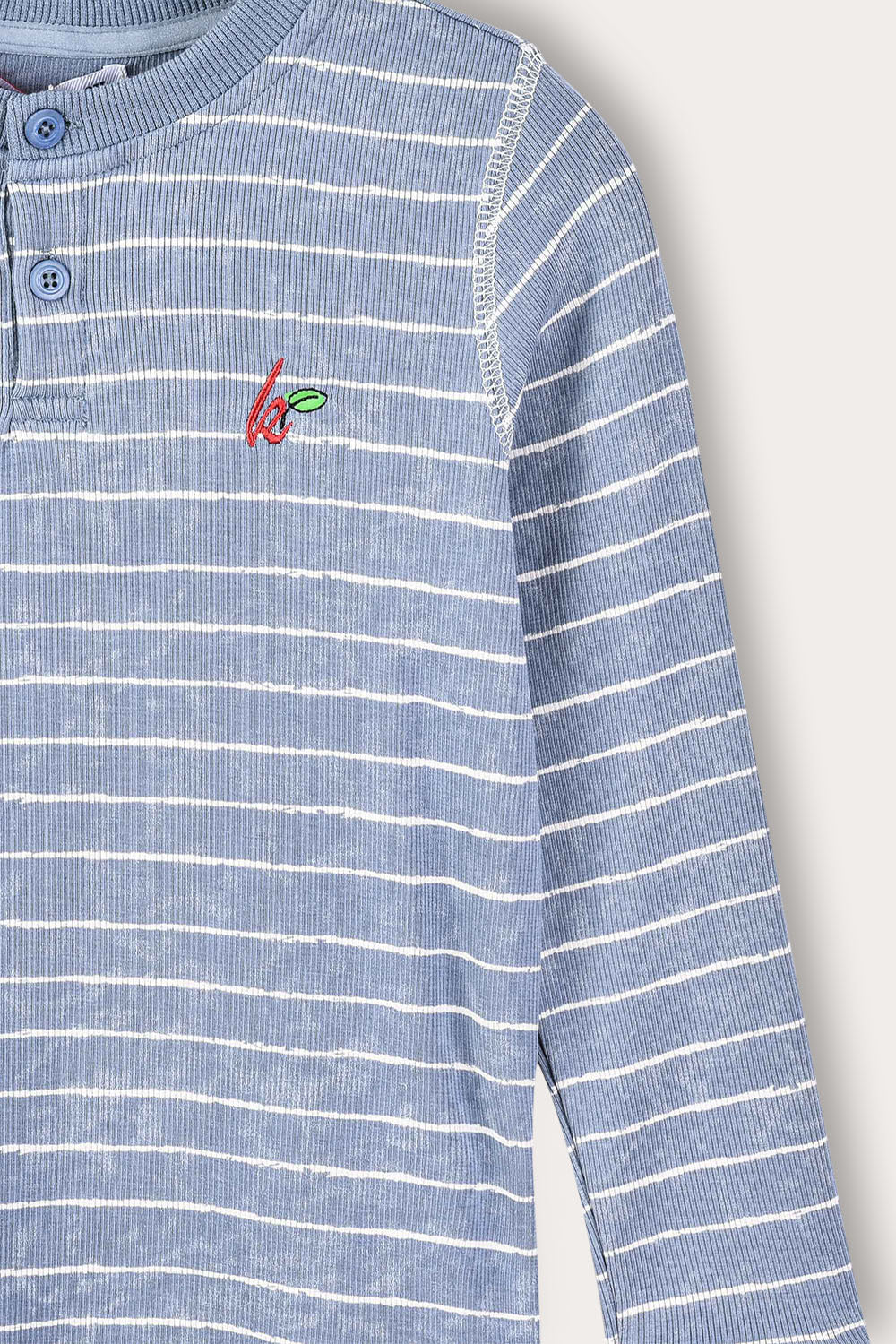 Comfortable and lightweight boys' shirt, in a flattering cut that includes - long sleeves, a round neckline with two buttons, and a ribbed finish for maximum fit. The design includes a striped print, delicate side embroidery and bold stitching - for a youthful and modern look. Made of soft and comfortable cotton blend fabric, a perfect choice for everyday activities.