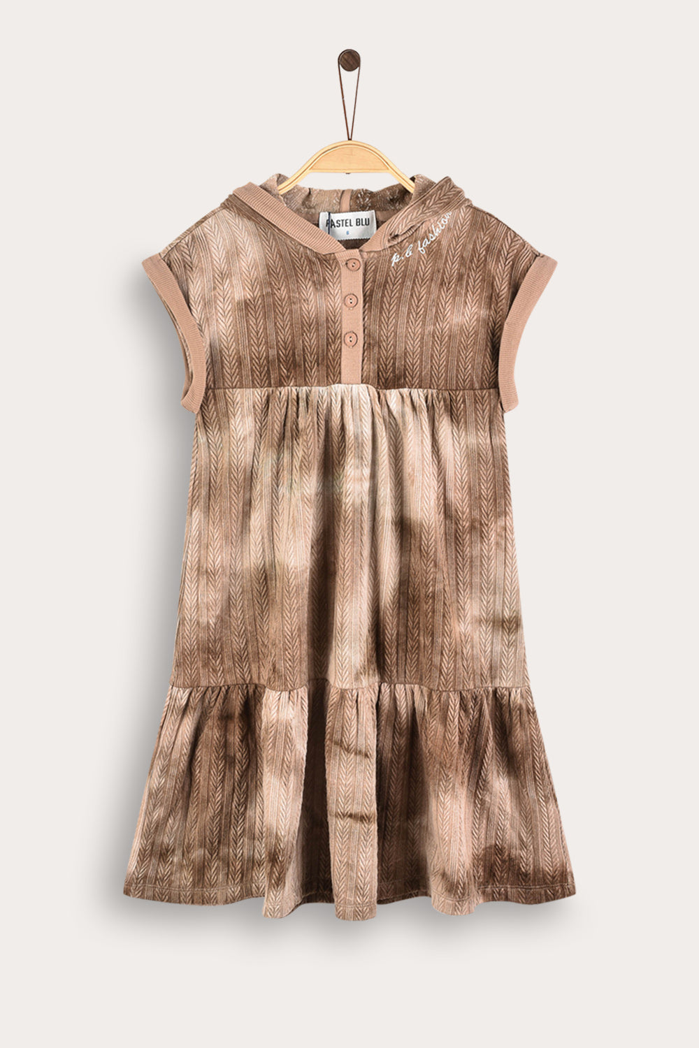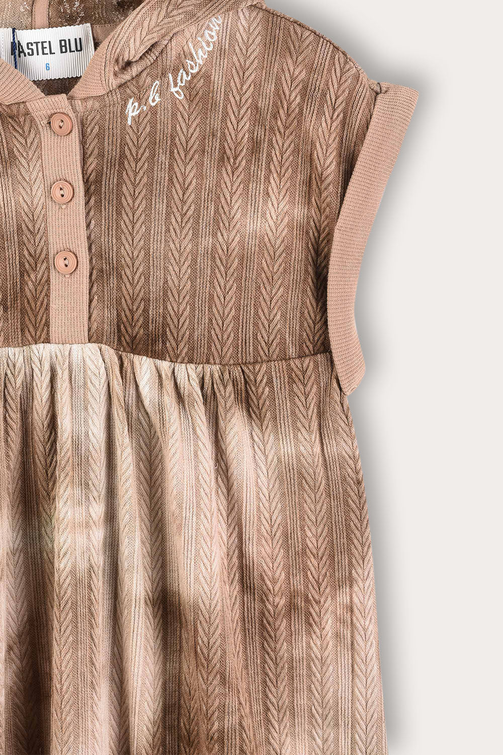 A comfortable sarafan for girls in a fashionable tie-dye design, made of a flexible and comfortable knit fabric with a delicate braid pattern. The cut includes a tiered skirt, a hooded cap and three front buttons - for comfortable and easy dressing. Side text embroidery - completes a handsome and graceful appearance, suitable for everyday use and family outings.