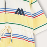 A stylish summer dress for girls, with a retro striped print and a stylish side emblem.