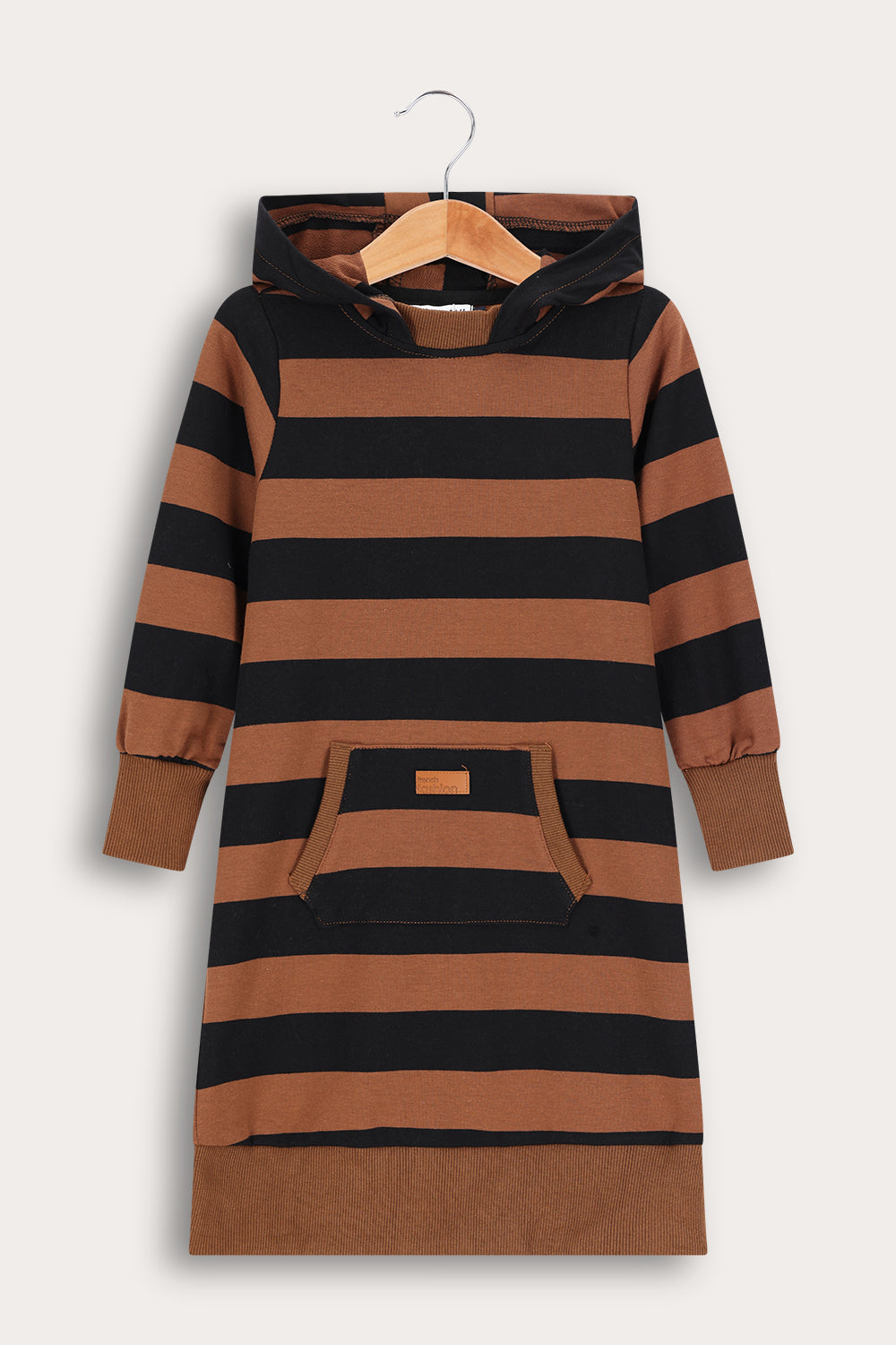 Striped dress with French terry hoodie - camel + black