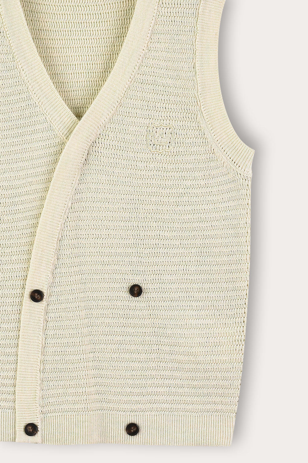 אפודת סריג חגיגית לבנים, בגזרת מעטפת וסגירת כפתורים אלגנטית.