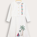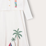 The top is a button-down cardigan with long sleeves, decorated with delicate tropical embroidery.