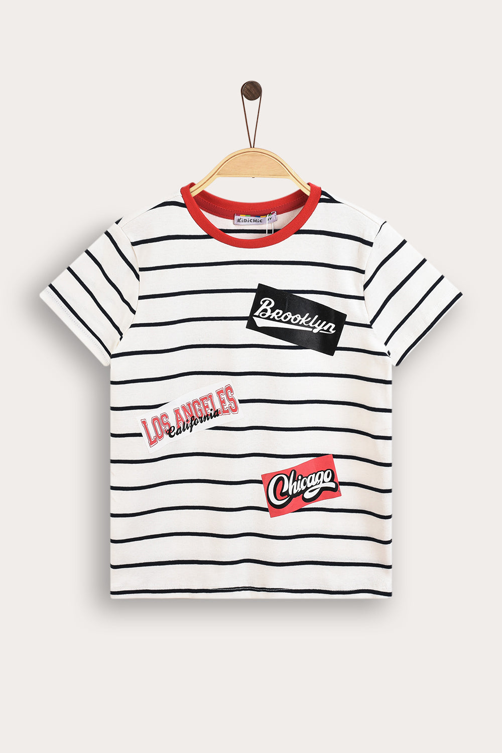 A summer T-shirt for baby, in a sweet and modern design with stripes and an urban-style silicone print. Made of soft and comfortable rib fabric, specially adapted to the baby's delicate skin and provides maximum comfort. Round neckline, designed with a ribbed stripe extension for a perfect fit. An ideal choice for everyday wear with a graceful and well-groomed look.