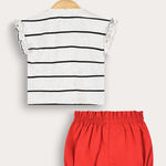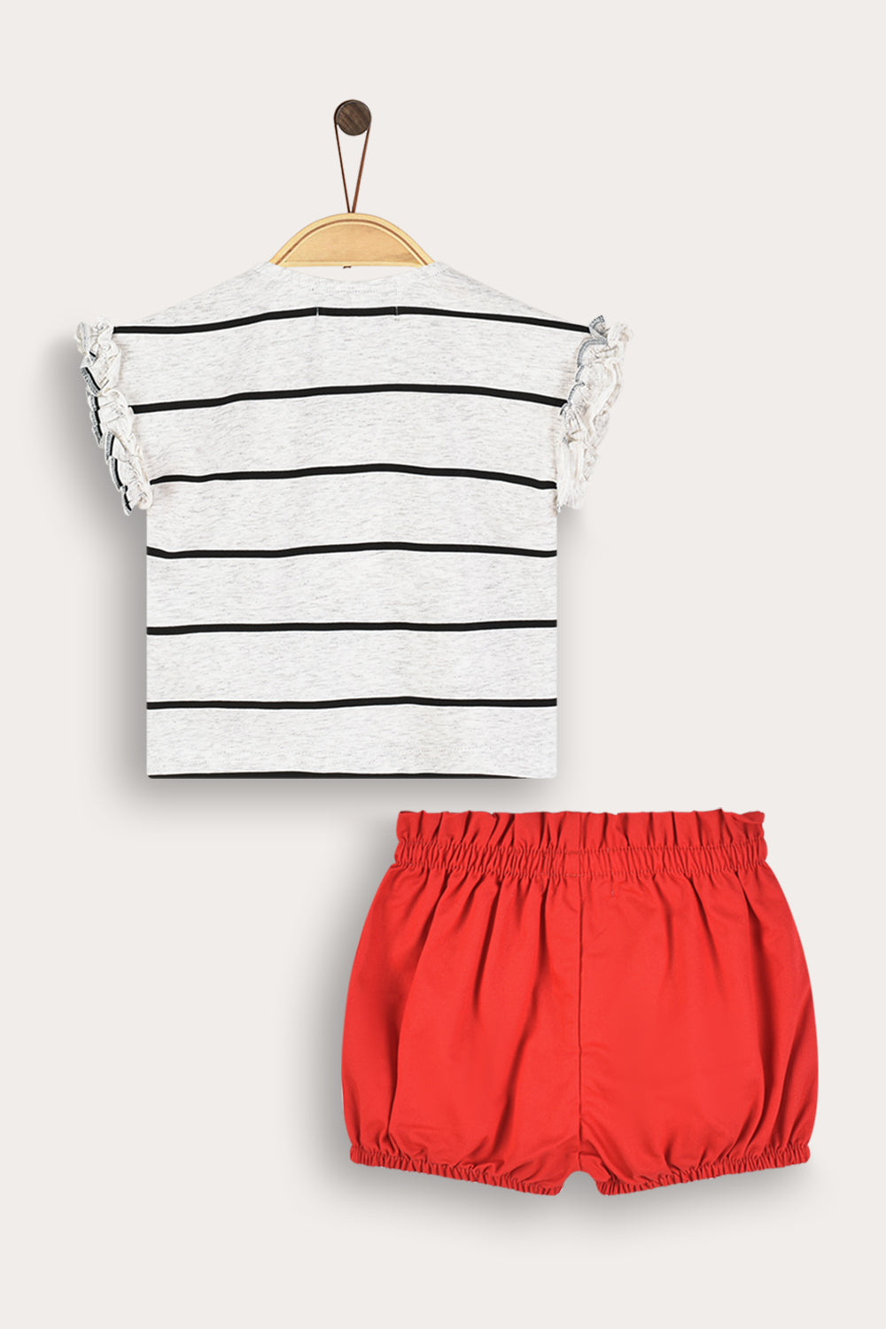 A two-piece summer set for a baby girl, made of a comfortable and breathable cotton blend fabric, suitable for delicate skin. The top is a shirt with delicate bow ties and muslin trims - for a sweet and graceful look. The bottom is shorts with gathers and two buttons for maximum fit. An ideal combination of style and comfort suitable for everyday life and family outings.