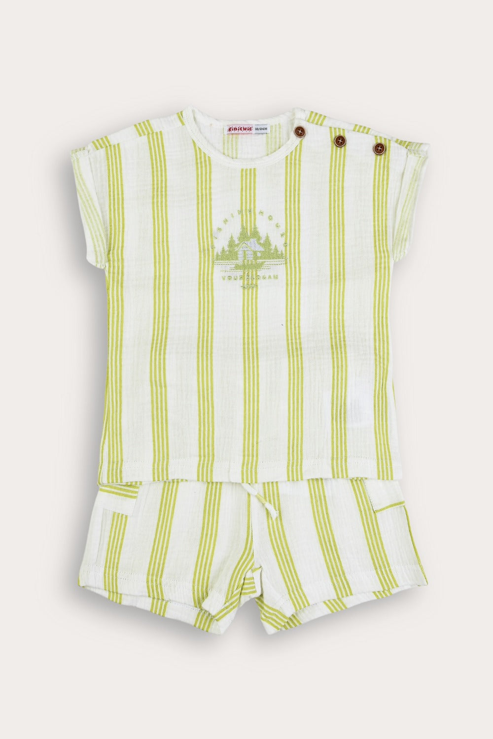 A two-piece set for babies in a unisex design suitable for both boys and girls. Made of high-quality, breathable cotton fabric - for maximum comfort throughout the day. The top is a shirt with short sleeves with a pleat, and three buttons on the shoulder - for quick and easy dressing. The bottom is shorts in a matching design - to complete a clean and tidy appearance.
