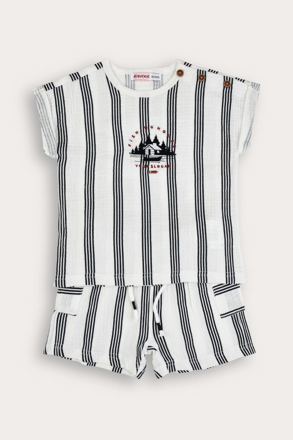 A two-piece set for babies in a unisex design suitable for both boys and girls. Made of high-quality, breathable cotton fabric - for maximum comfort throughout the day. The top is a shirt with short sleeves with a pleat, and three buttons on the shoulder - for quick and easy dressing. The bottom is shorts in a matching design - to complete a clean and tidy appearance.