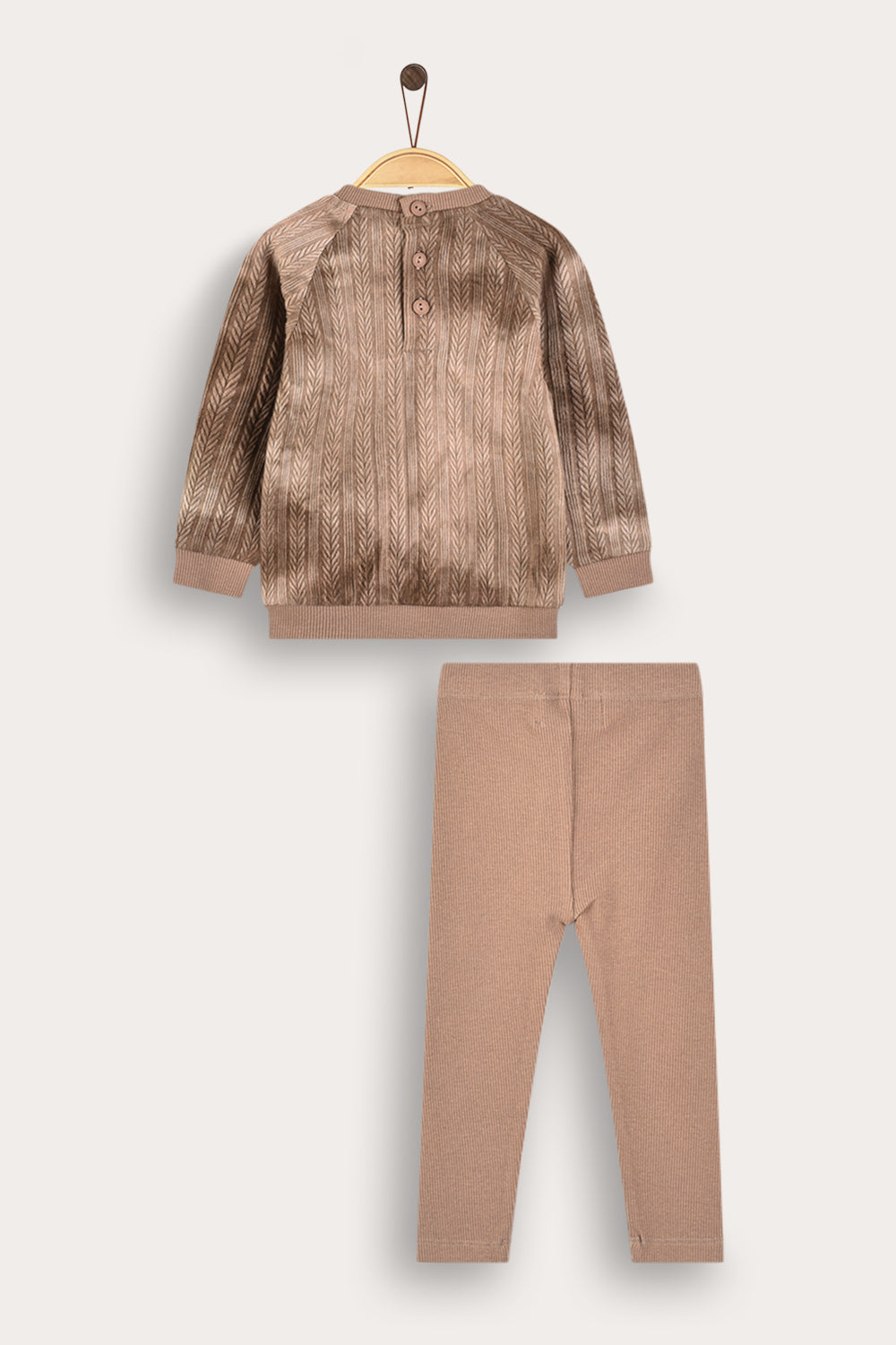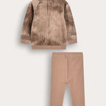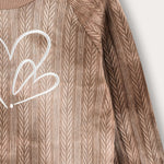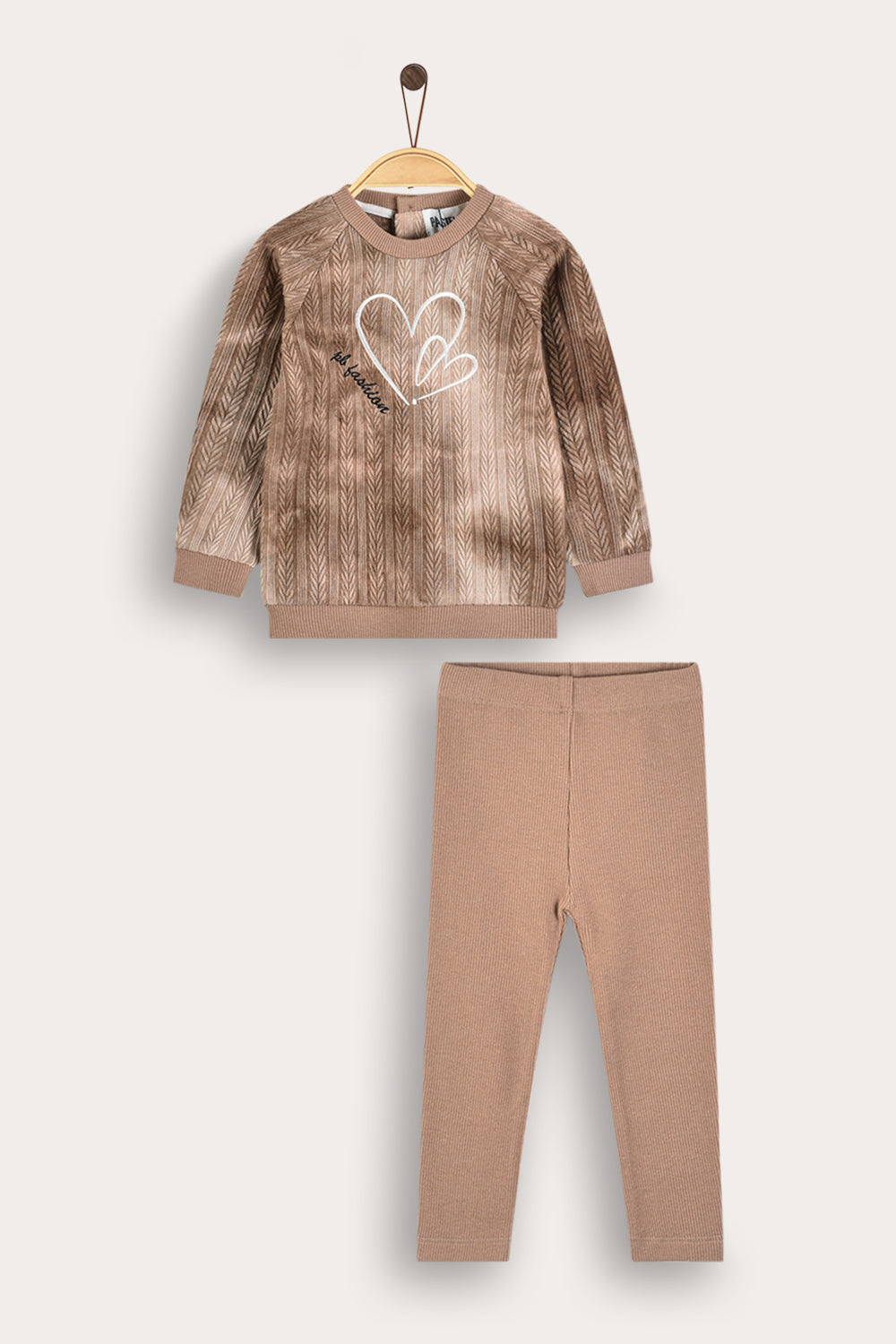 A sweet two-piece set for a baby girl in a fashionable and comfortable design. The top is a long-sleeved shirt, made of knit fabric with a delicate braid pattern, in a special tie-dye dyeing combined with a graceful front heart embroidery. The bottom is ribbed tights in a matching design made of a pleasant and flexible fabric - for maximum comfort throughout the day.