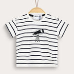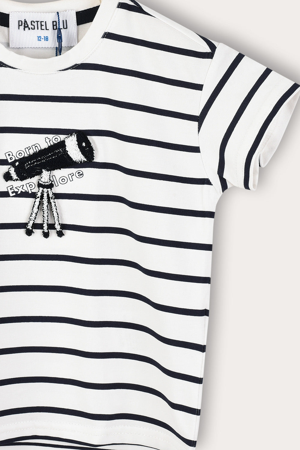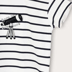 Baby T-shirt, made of high-quality, breathable cotton blend fabric, suitable for baby's delicate skin. The cut includes short sleeves and a round neckline for maximum comfort. Classic striped print and telescope appliqué - complete a sweet and fashionable appearance. Design suitable for activities and daily routine, especially for your curious little ones.