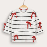 חולצת טי שירט לבנות, בעיצוב אופנתי וייחודי, עשויה מבד תערובת כותנה איכותי ונושם לנוחות מירבית לאורך כל היום. הגזרה כוללת פתח צוואר עגול ושרוולים פרקטיים באורך 3/4. הדפס פסים וקישוטי סרטי פפיונים - משלימים הופעה חיננית ועדכנית, בחירה מושלמת לשילוב עם חצאיות ולמראה מתוק ומסודר.