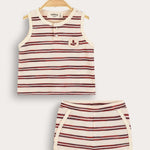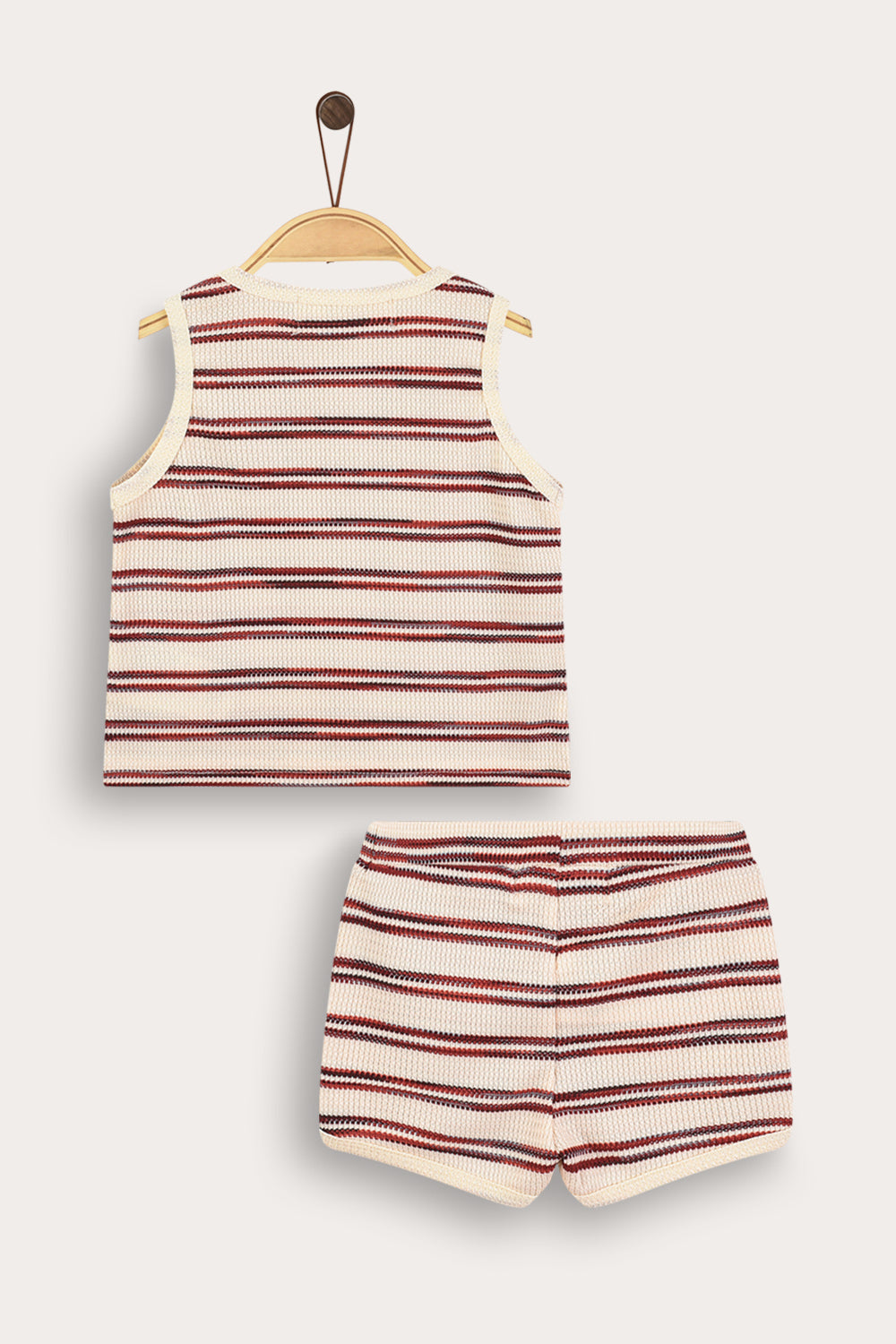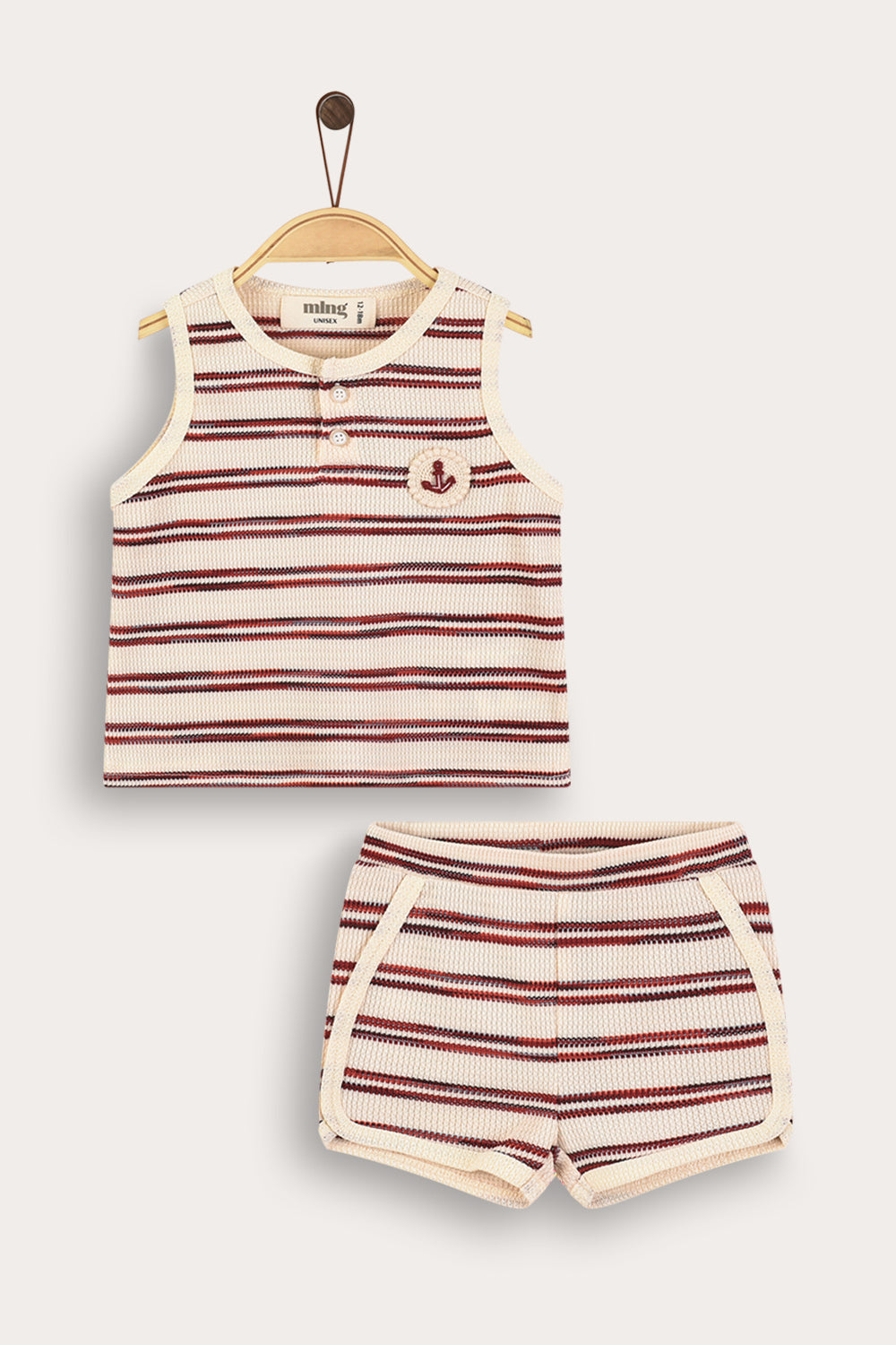 The bottom part is matching shorts in a striped pattern, for maximum comfort on summer days.