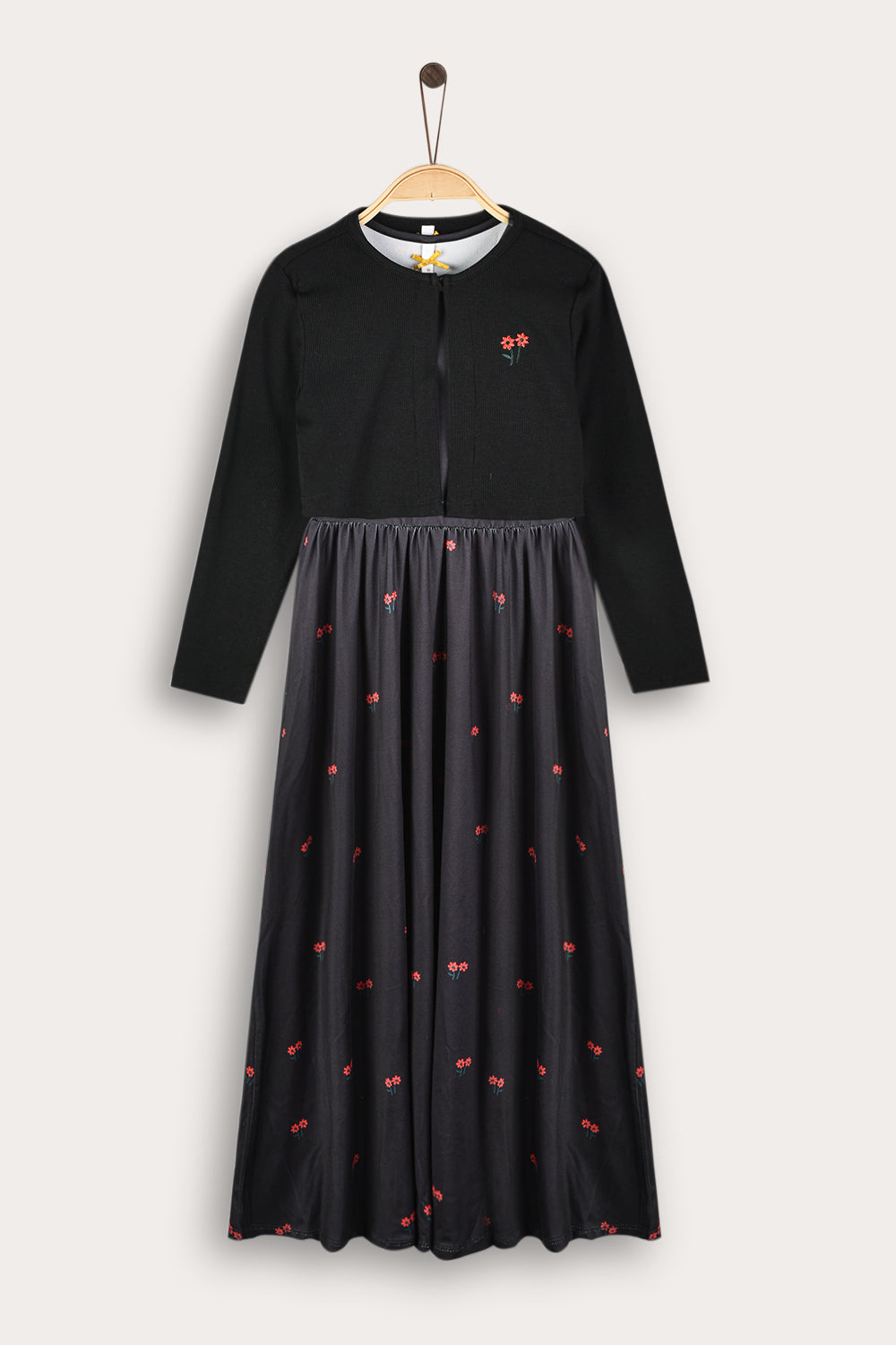 A long and impressive housecoat for girls, combined with a matching knit cardigan with long sleeves. A floral motif completes an elegant and festive appearance, suitable for leisure hours on Saturdays and holidays.