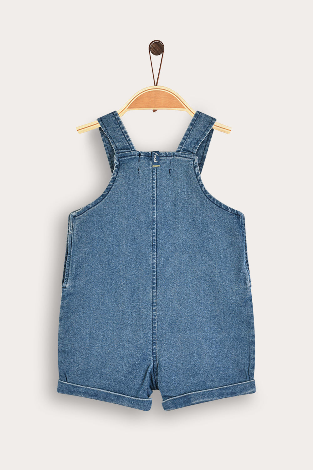 אוברול ג'ינס לתינוק, עם כתפיות וקישוט קרושה קייצי.