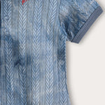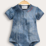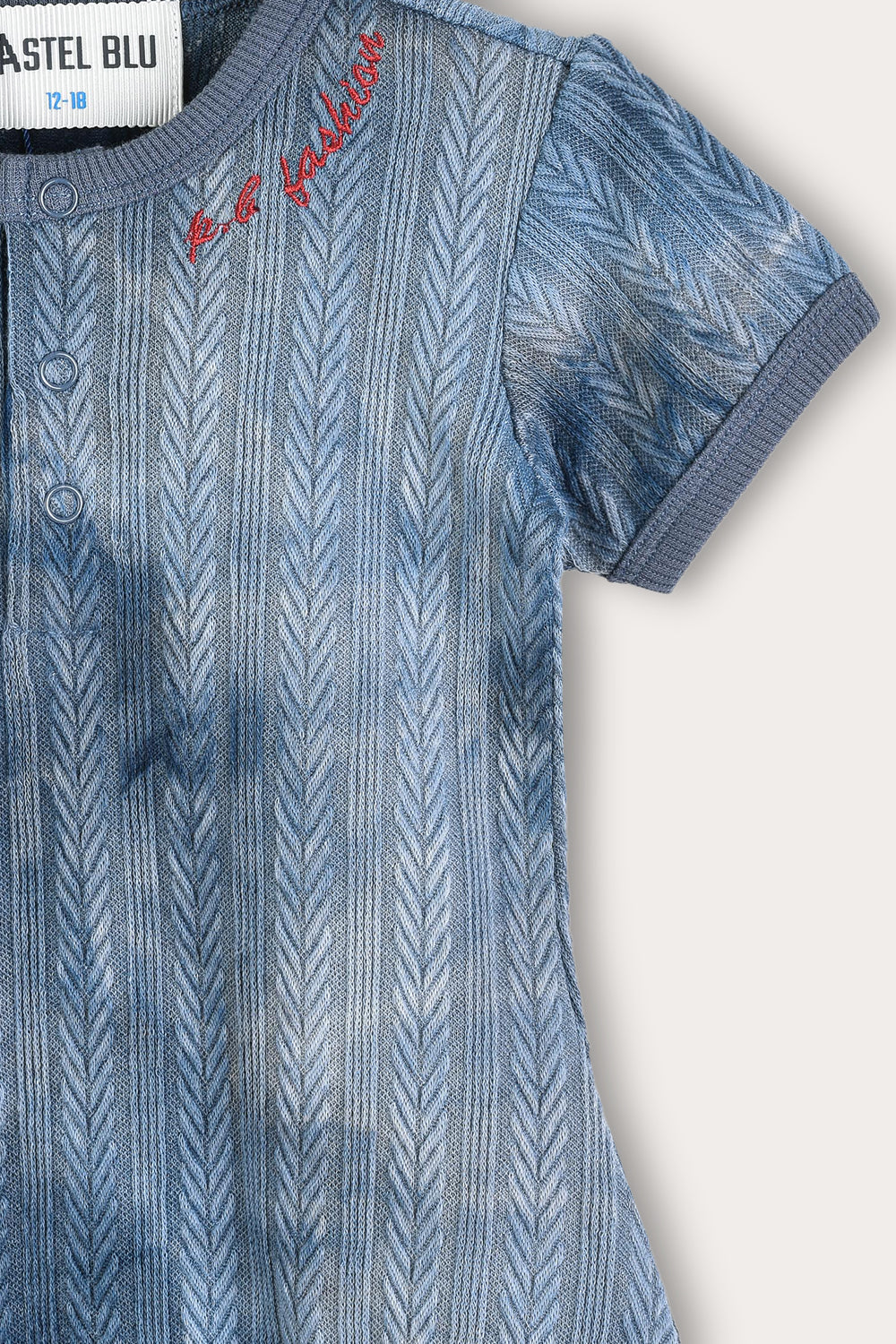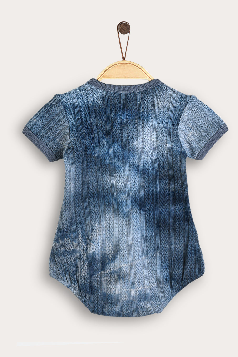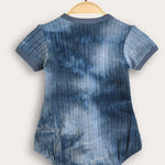 A fashionable baby jumpsuit with a unique tie-dye design, made of a flexible and comfortable knit fabric with a delicate braid pattern. The cut includes short sleeves, a round neckline with text embroidery and a handy snap closure - for quick and easy dressing. A practical and stylish item, suitable for everyday use and outings with the little ones.