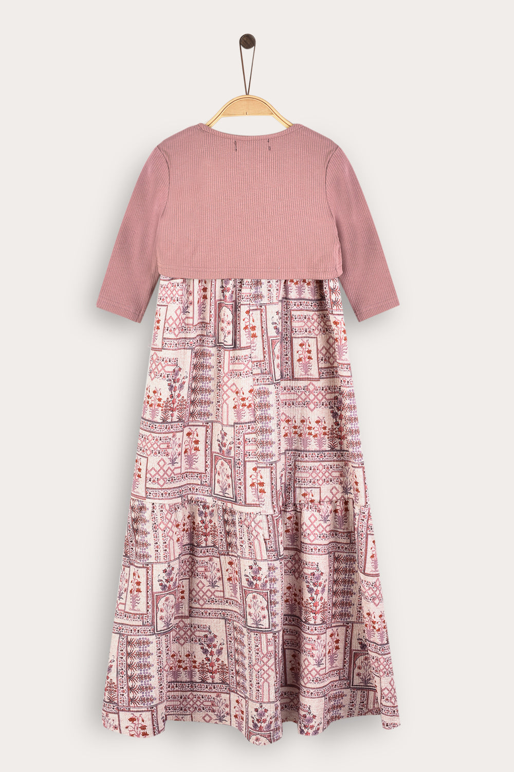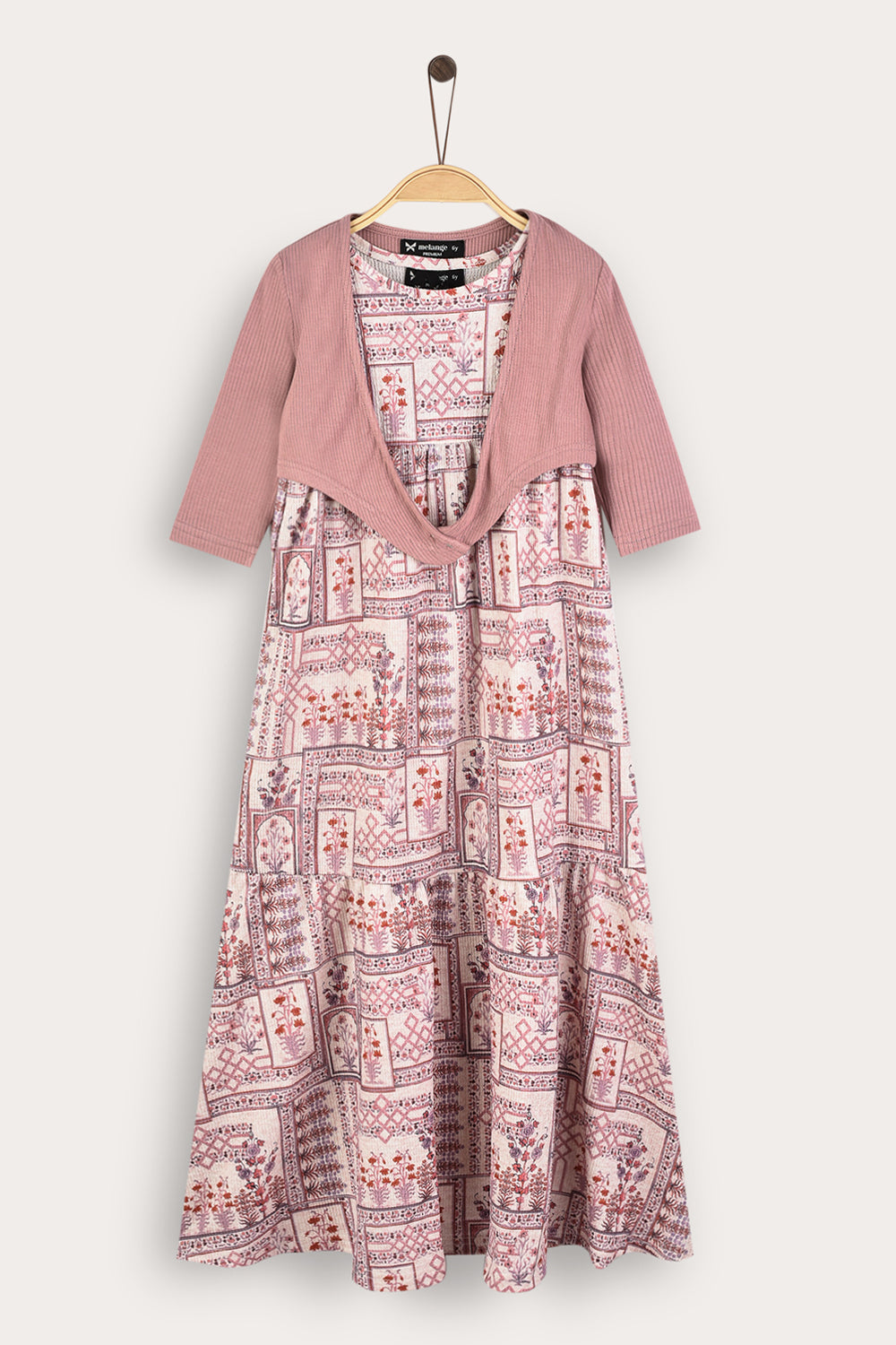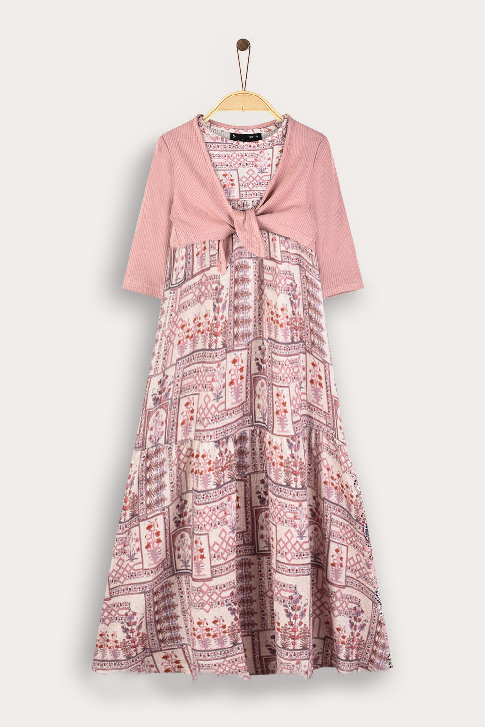 A unique Shabbat robe for girls with an elegant and dignified design, with a flattering ankle length. The robe is decorated with a rich ethnic print that gives a festive and impressive look. Comes with a cardigan in a matching shade and a front tie to complete the look. A perfect choice for Shabbat and holidays, combining comfort with meticulous style.