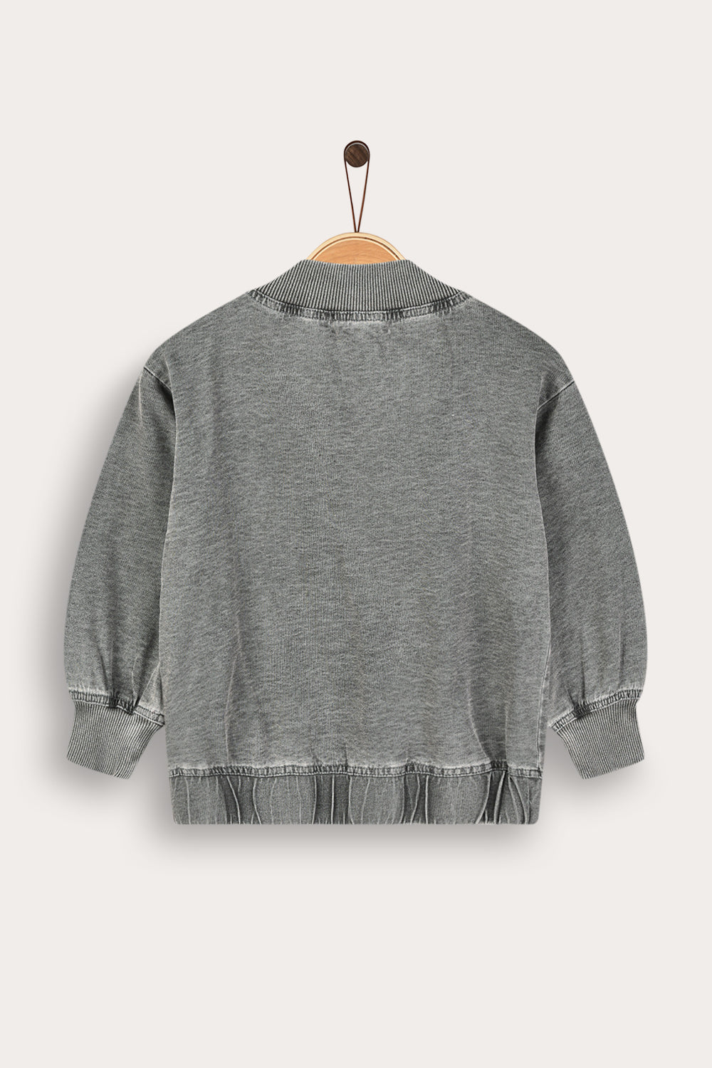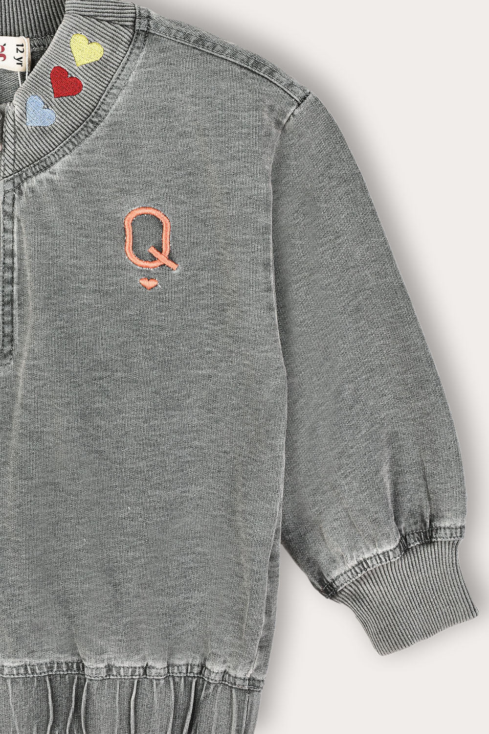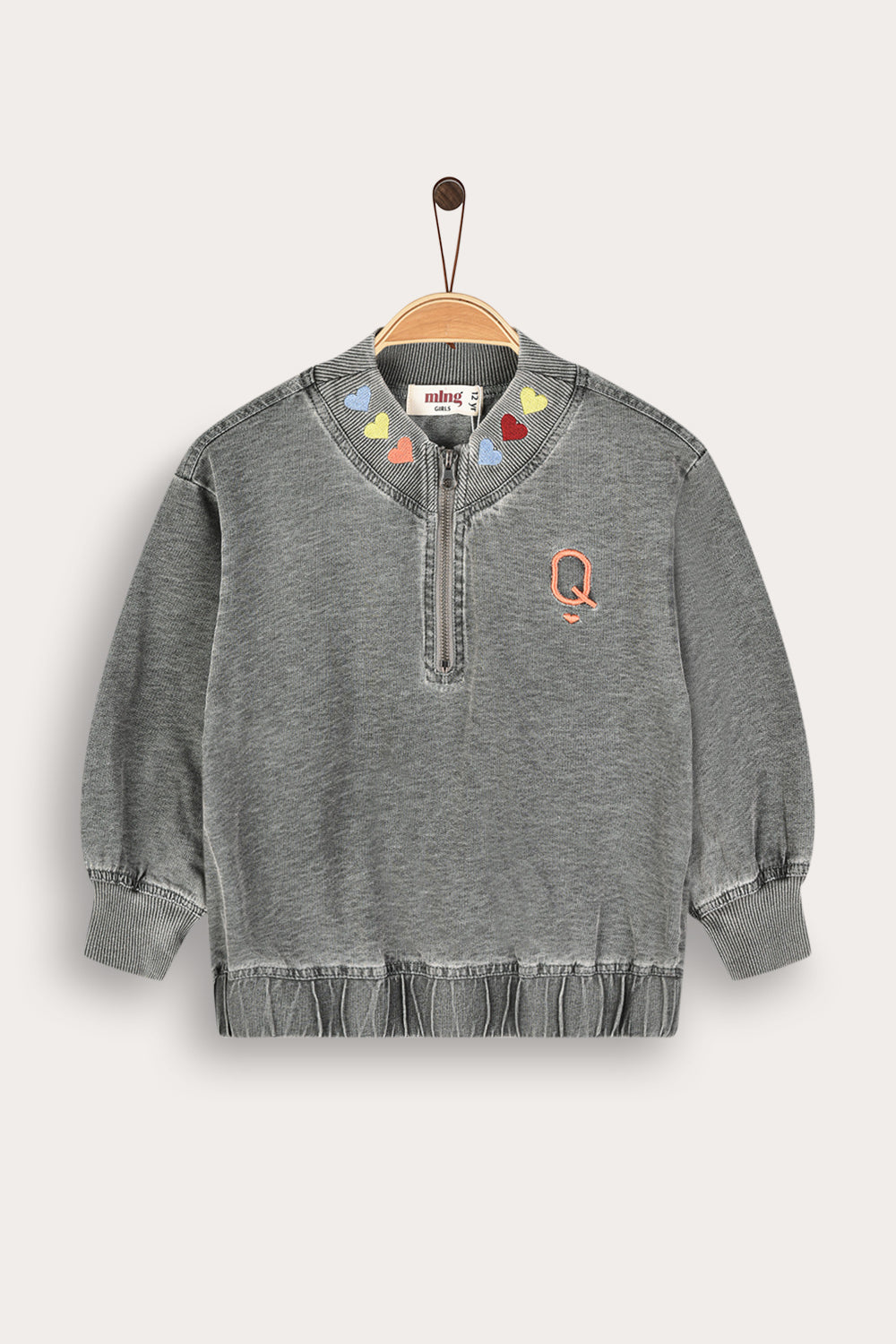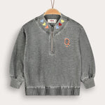A girls' shirt with a youthful and unique look, combining comfort with a meticulous everyday style. Made of high-quality denim fabric made from a cotton blend, comfortable to wear and durable over time. The design includes a front zipper, a thick ribbed neckline with a print and embroidery with a card motif. A perfect choice for a fashionable and original appearance.